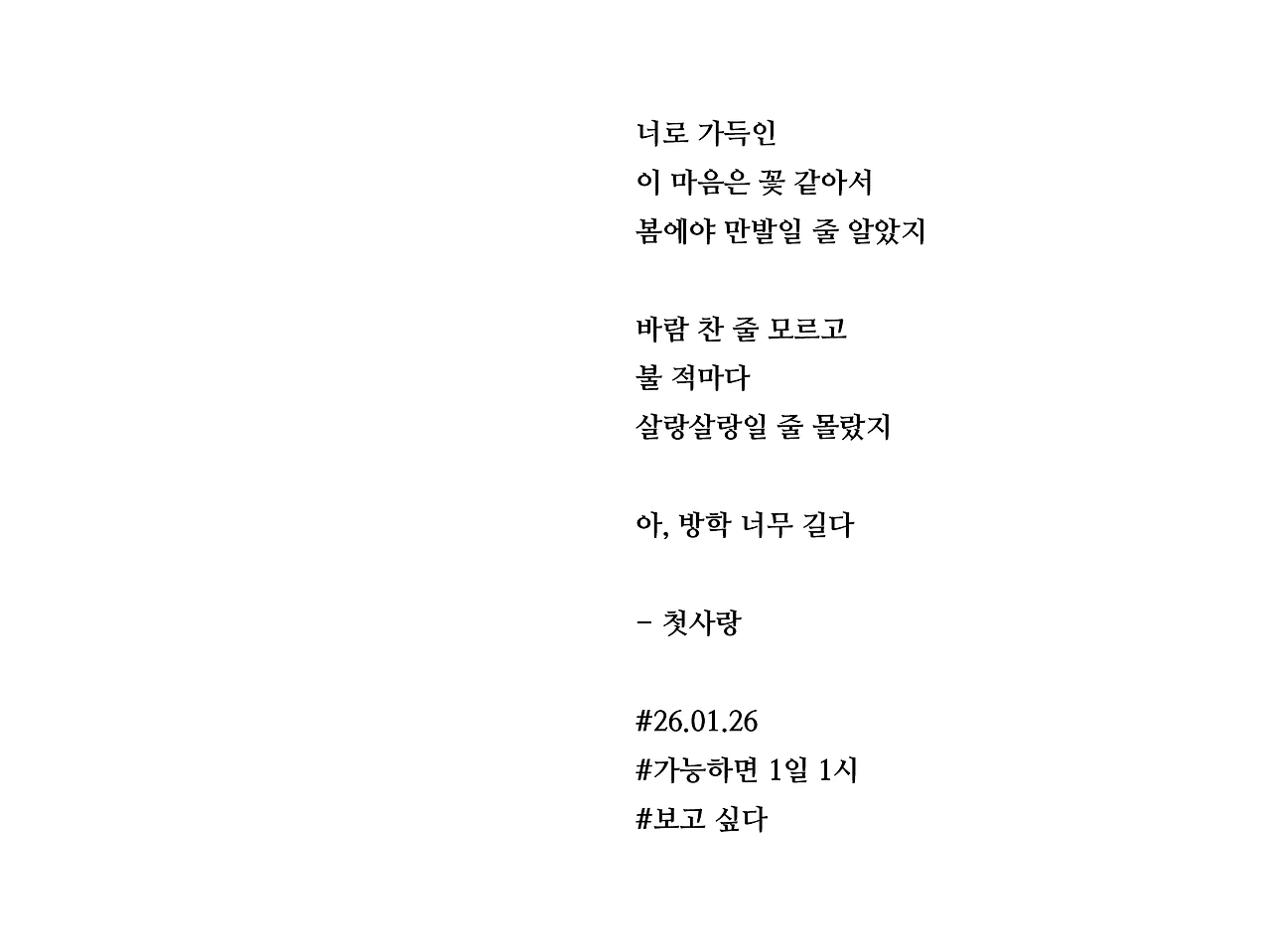너로 가득인이 마음은 꽃 같아서봄에야 만발일 줄 알았지바람 찬 줄 모르고불 적마다살랑살랑일 줄 몰랐지아, 방학 너무 길다- 첫사랑#26.01.26#가능하면 1일 1시#보고 싶다