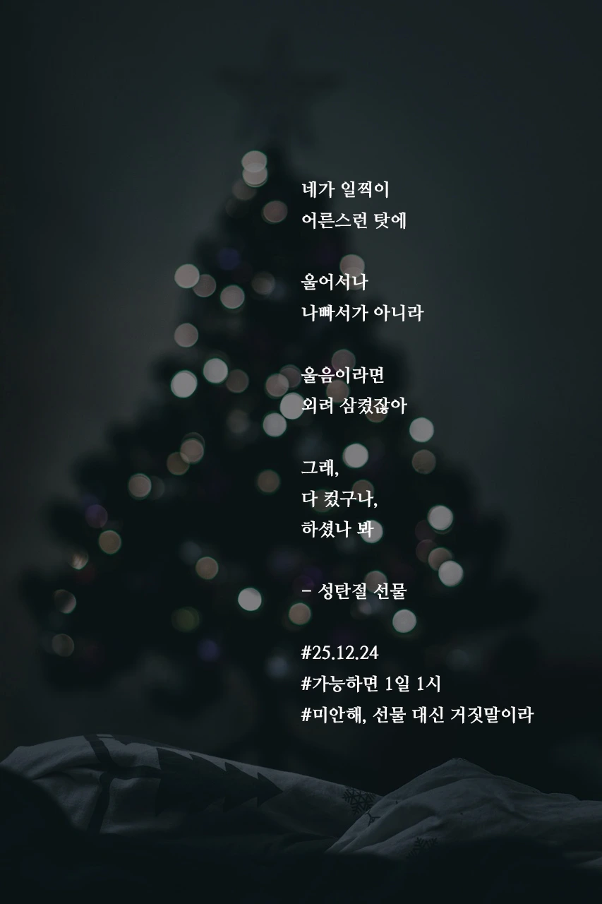 네가 일찍이어른스런 탓에울어서나나빠서가 아니라울음이라면외려 삼켰잖아그래,다 컸구나,하셨나 봐- 성탄절 선물#25.12.24#가능하면 1일 1시#미안해, 선물 대신 거짓말이라
