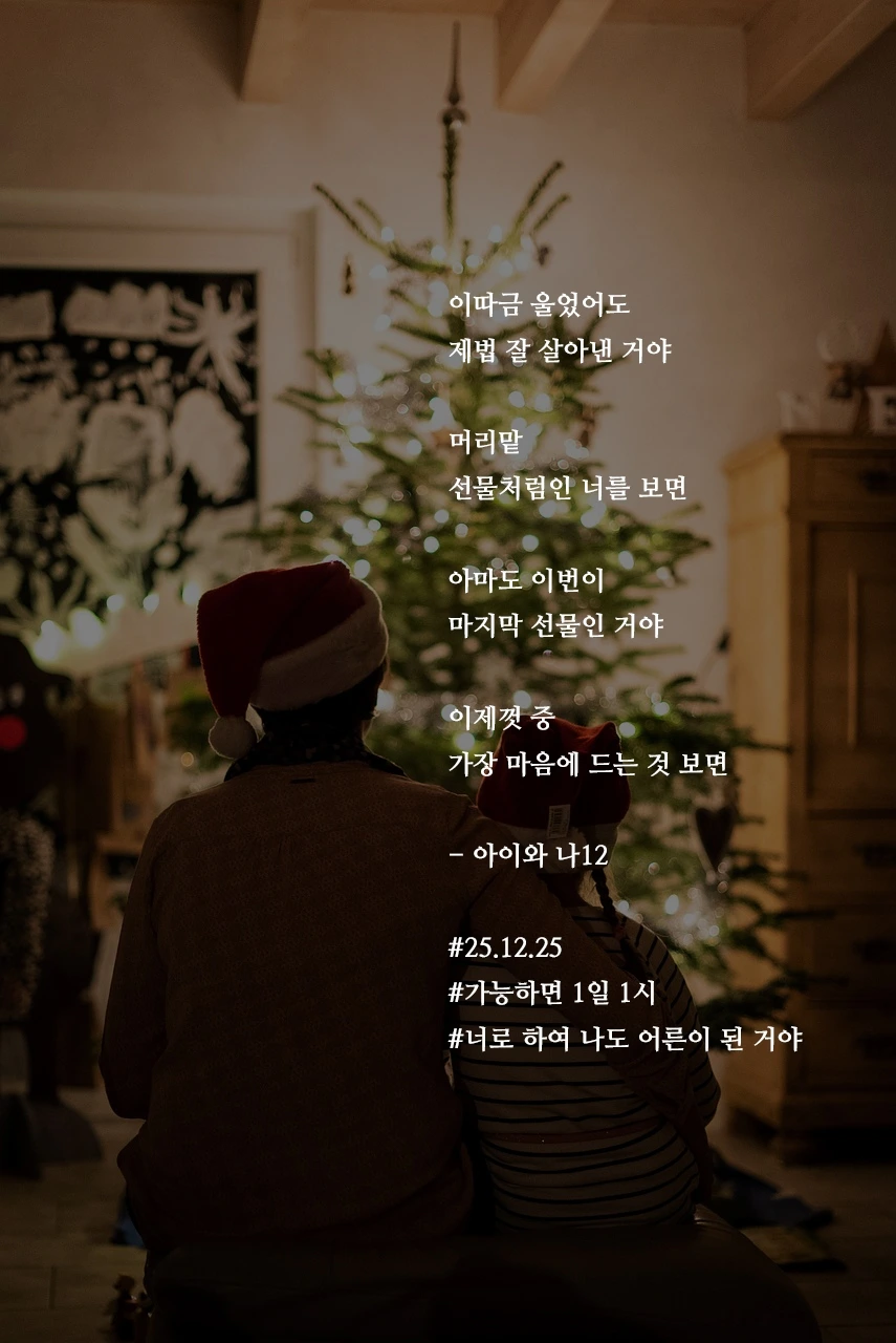 이따금 울었어도제법 잘 살아낸 거야머리맡선물처럼인 너를 보면아마도 이번이마지막 선물인 거야이제껏 중가장 마음에 드는 것 보면- 아이와 나12#25.12.25#가능하면 1일 1시#너로 하여 나도 어른이 된 거야 작가의 말: 아가야, 네가 나의 마지막 크리스마스 선물이야