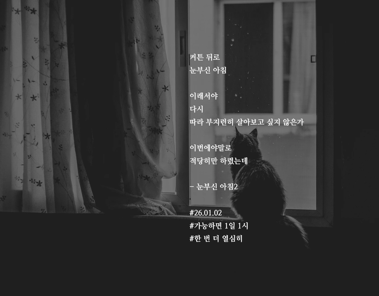 커튼 뒤로눈부신 아침이래서야다시따라 부지런히 살아보고 싶지 않은가이번에야말로적당히만 하렸는데- 눈부신 아침2#26.01.02#가능하면 1일 1시#한 번 더 열심히 작가의 말: 그렇게 다시 부지런히