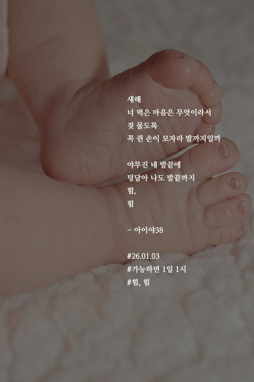 새해너 먹은 마음은 무엇이라서젖 물도록꼭 쥔 손이 모자라 발까지일까야무진 네 발끝에덩달아 나도 발끝까지힘,힘- 아이야38#26.01.03#가능하면 1일 1시#힘, 힘 작가의 말: 너도 나도 같이 힘!