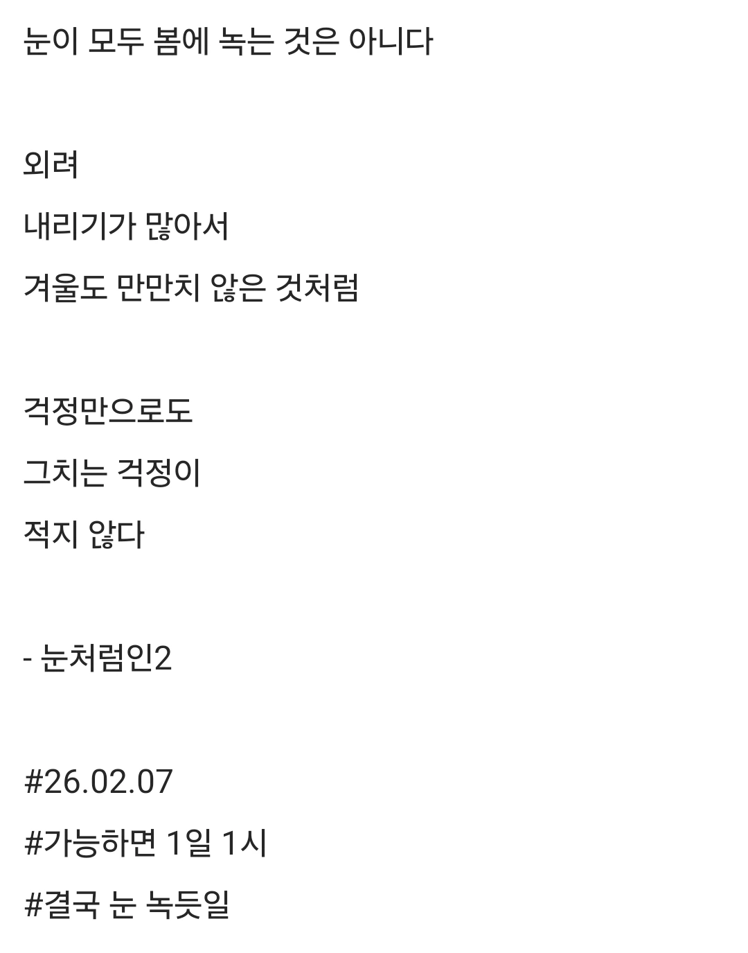 눈이 모두 봄에 녹는 것은 아니다외려내리기가 많아서겨울도 만만치 않은 것처럼걱정만으로도그치는 걱정이 적지 않다 - 눈처럼인2#26.02.07#가능하면 1일 1시#결국 눈 녹듯일