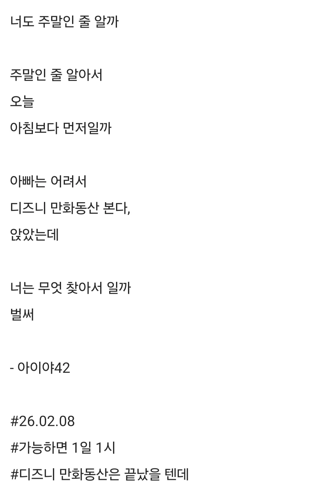 너도 주말인 줄 알까주말인 줄 알아서오늘아침보다 먼저일까아빠는 어려서디즈니 만화동산 본다,앉았는데너는 무엇 찾아서 일까벌써- 아이야42#26.02.08#가능하면 1일 1시#디즈니 만화동산은 끝났을 텐데