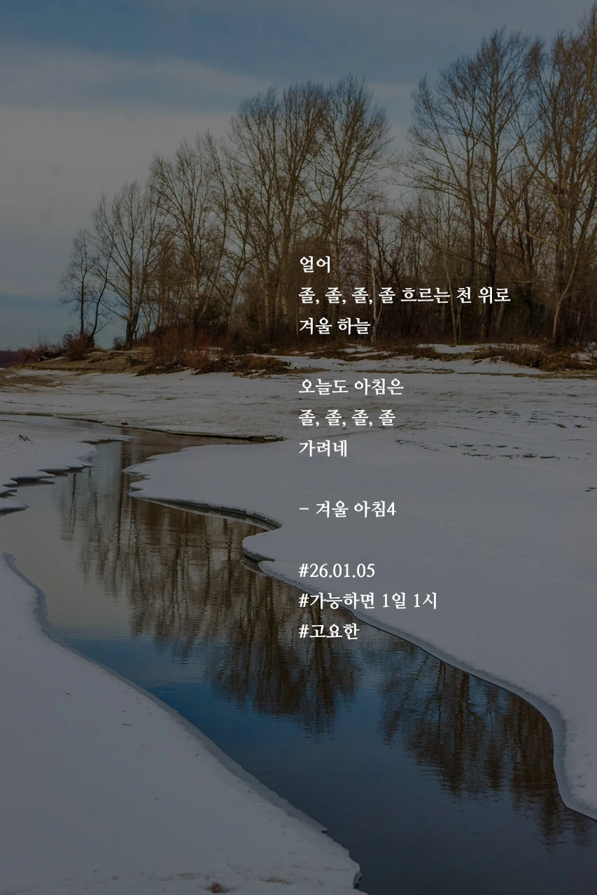 얼어졸, 졸, 졸, 졸 흐르는 천 위로겨울 하늘오늘도 아침은졸, 졸, 졸, 졸가려네- 겨울 아침4#26.01.05#가능하면 1일 1시#고요한 작가의 말: 푸른 하늘 따라 졸, 졸, 졸