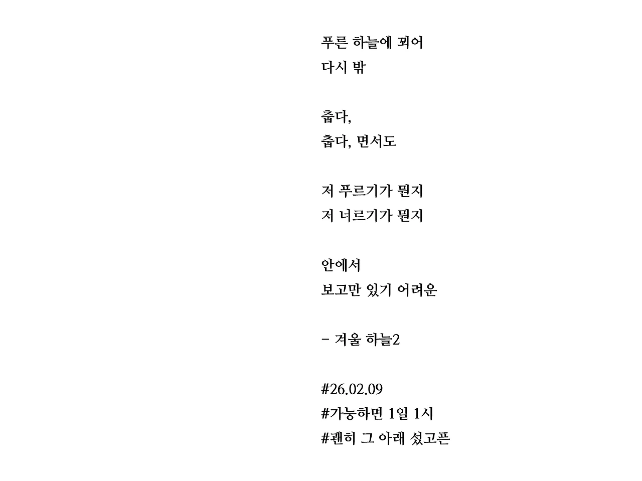 푸른 하늘에 꾀어다시 밖춥다,춥다, 면서도저 푸르기가 뭔지저 너르기가 뭔지안에서보고만 있기 어려운- 겨울 하늘2#26.02.09#가능하면 1일 1시#괜히 그 아래 섰고픈