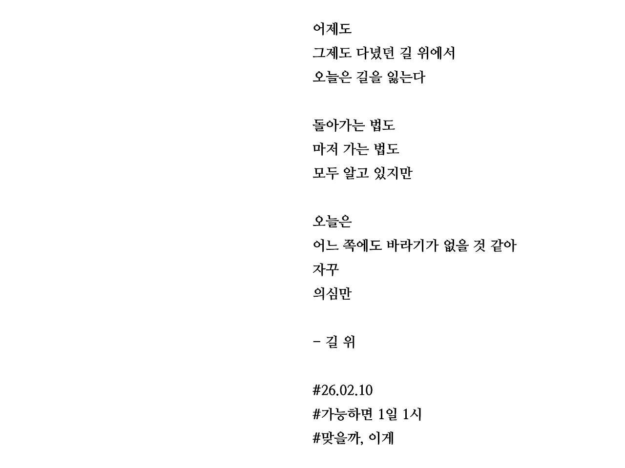 어제도그제도 다녔던 길 위에서오늘은 길을 잃는다돌아가는 법도마저 가는 법도모두 알고 있지만오늘은어느 쪽에도 바라기가 없을 것 같아자꾸의심만- 길 위 #26.02.10#가능하면 1일 1시#맞을까, 이게