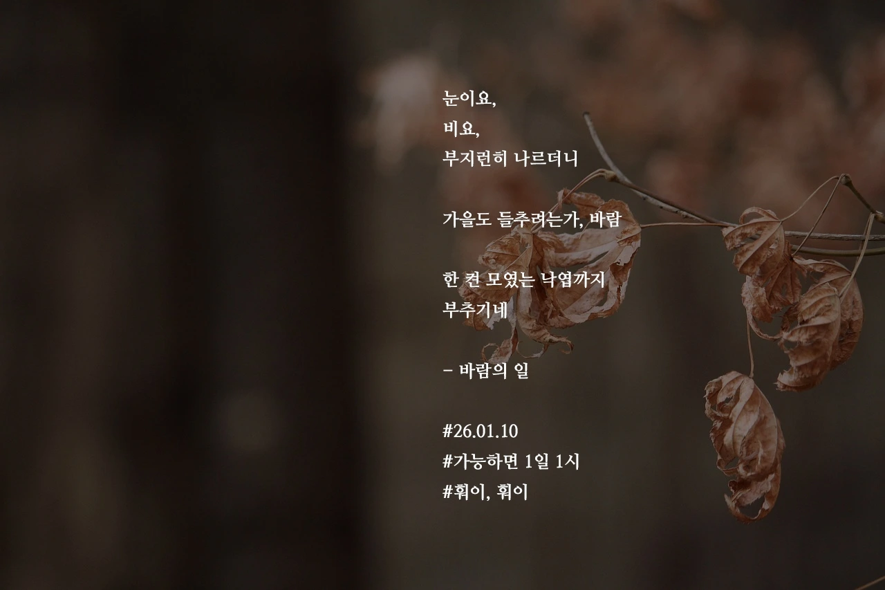 눈이요,비요,부지런히 나르더니가을도 들추려는가, 바람한 켠 모였는 낙엽까지부추기네- 바람의 일#26.01.10#가능하면 1일 1시#훠이, 훠이 작가의 말: 바람이 많았던 겨울날