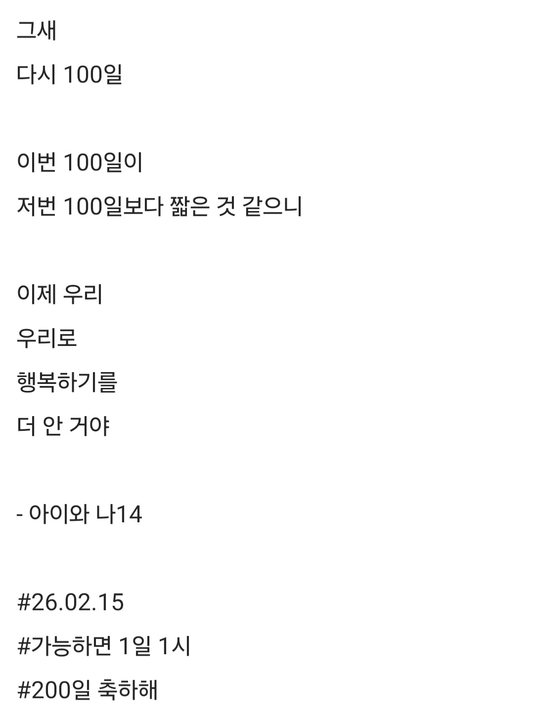 그새다시 100일이번 100일이저번 100일보다 짧은 것 같으니이제 우리우리로행복하기를더 안 거야- 아이와 나14#26.02.15#가능하면 1일 1시#200일 축하해