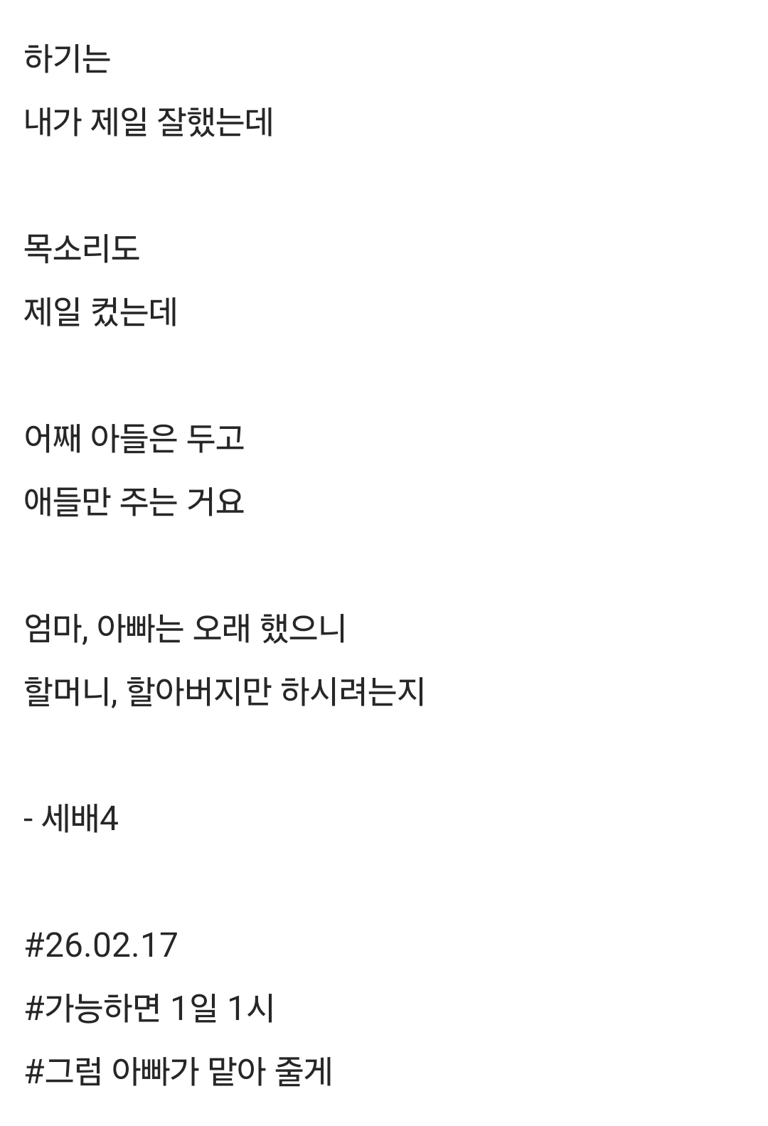 하기는내가 제일 잘했는데목소리도제일 컸는데어째 아들은 두고애들만 주는 거요엄마, 아빠는 오래 했으니할머니, 할아버지만 하시려는지- 세배4#26.02.17#가능하면 1일 1시#그럼 아빠가 맡아 줄게