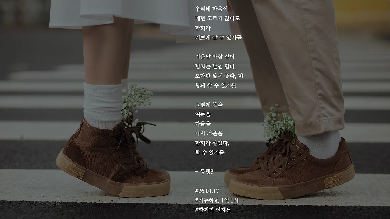 우리네 마음이매번 고르지 않아도함께라기쁘게 살 수 있기를겨울날 바람 같이넘치는 날엔 답다,모자란 날에 좋다, 며함께 살 수 있기를그렇게 봄을여름을가을을다시 겨울을함께라 살았다,할 수 있기를- 동행3#26.01.17#가능하면 1일 1시#함께면 언제든 작가의 말: 늘 함께면 좋겠다, 당신과