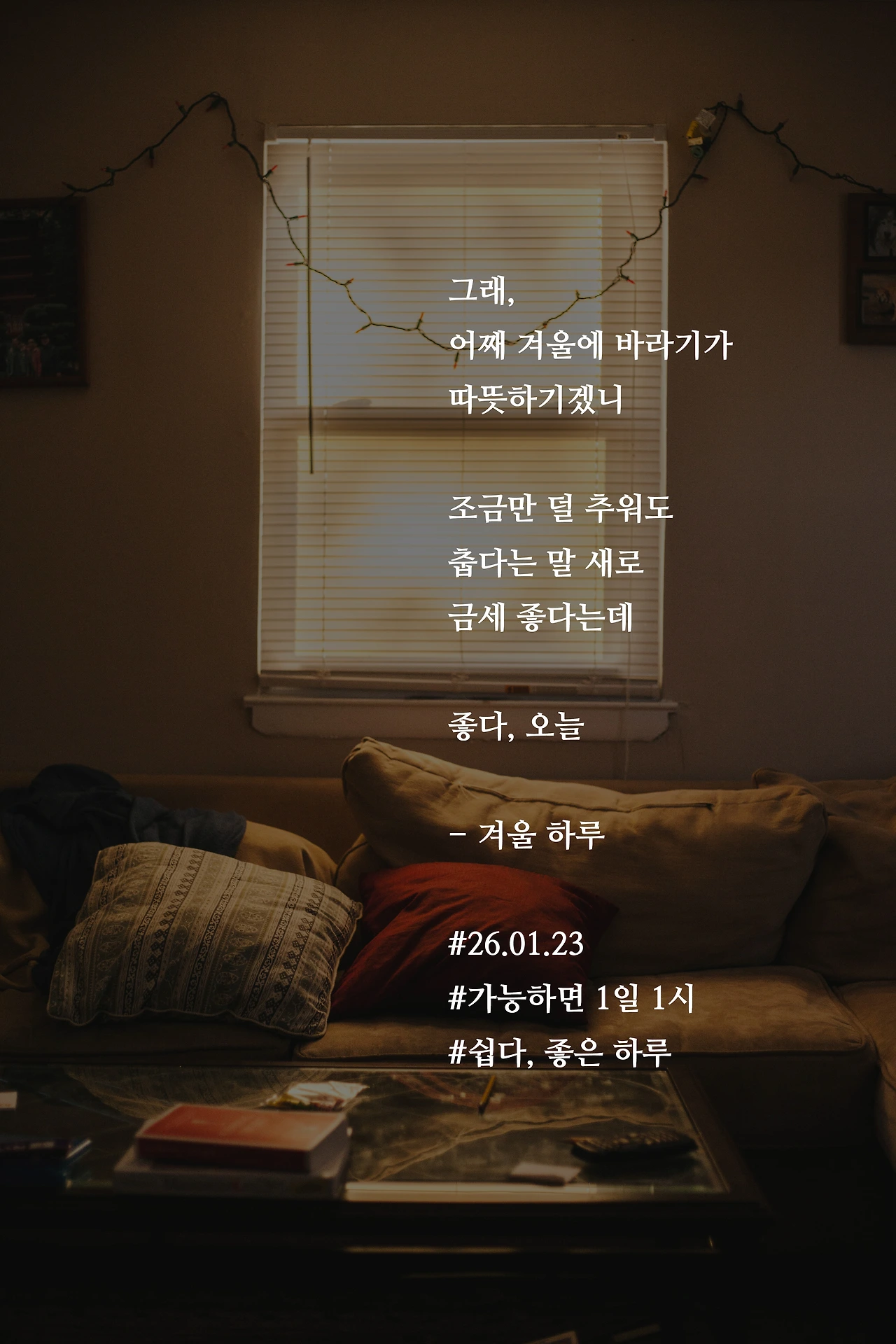 그래,어째 겨울에 바라기가따뜻하기겠니조금만 덜 추워도춥다는 말 새로금세 좋다는데좋다, 오늘- 겨울 하루#26.01.23#가능하면 1일 1시#쉽다, 좋은 하루