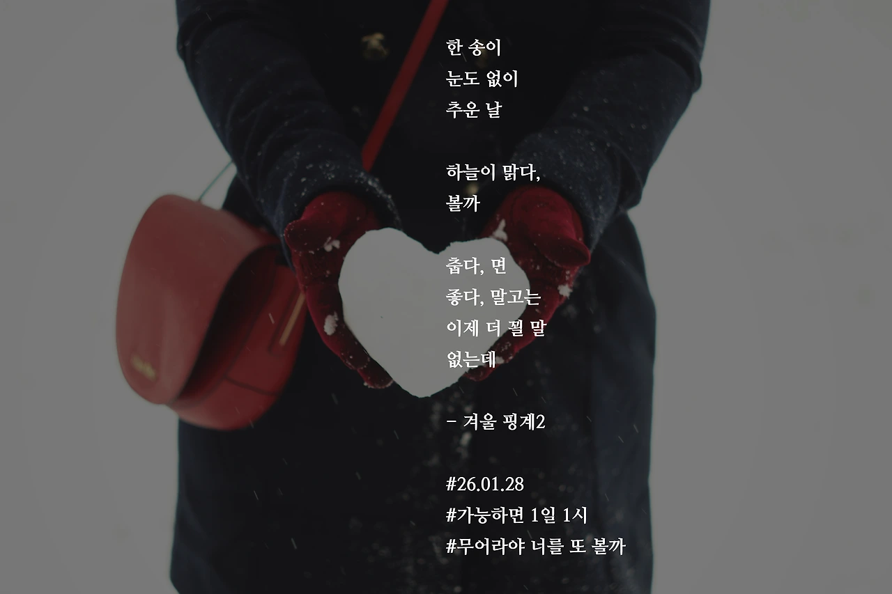 한 송이눈도 없이추운 날하늘이 맑다,볼까춥다, 면좋다, 말고는이제 더 꾈 말없는데- 겨울 핑계2#26.01.28#가능하면 1일 1시#무어라야 너를 또 볼까