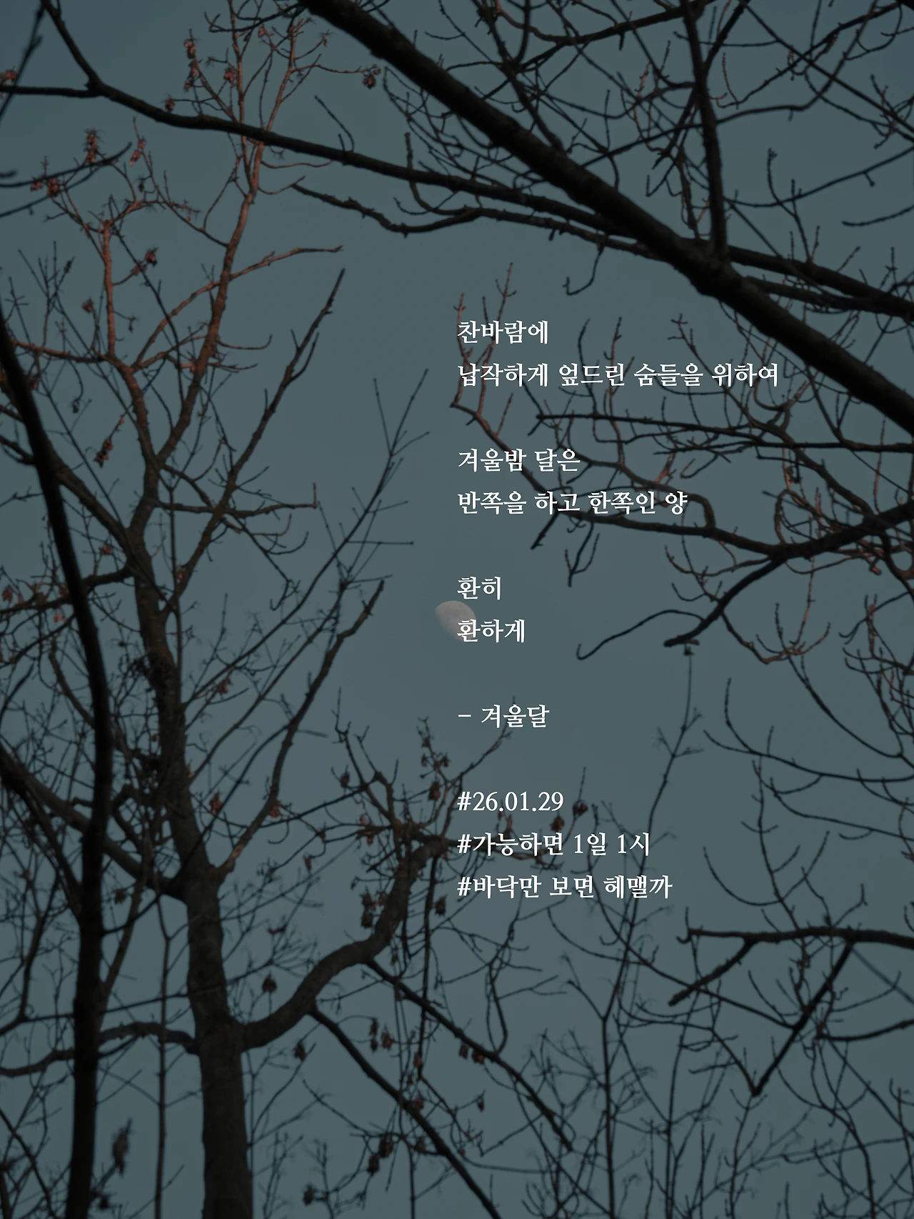 찬바람에납작하게 엎드린 숨들을 위하여겨울밤 달은반쪽을 하고 한쪽인 양환히환하게- 겨울달#26.01.29#가능하면 1일 1시#바닥만 보면 헤맬까