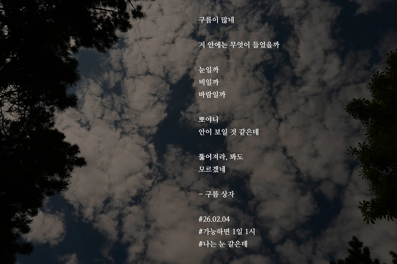 구름이 많네저 안에는 무엇이 들었을까눈일까비일까바람일까뽀야니안이 보일 것 같은데뚫어져라, 봐도모르겠네- 구름 상자#26.02.04#가능하면 1일 1시#나는 눈 같은데