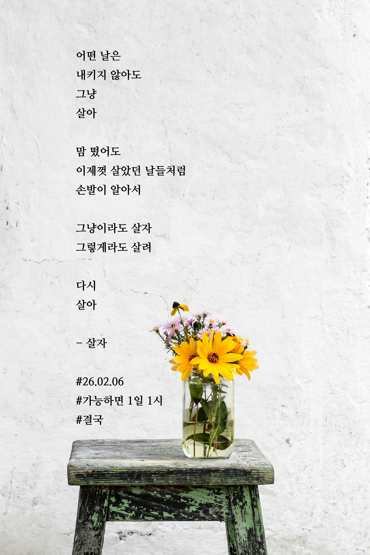 어떤 날은내키지 않아도그냥살아맘 떴어도이제껏 살았던 날들처럼손발이 알아서그냥이라도 살자그렇게라도 살려다시살아- 살자#26.02.06#가능하면 1일 1시#결국