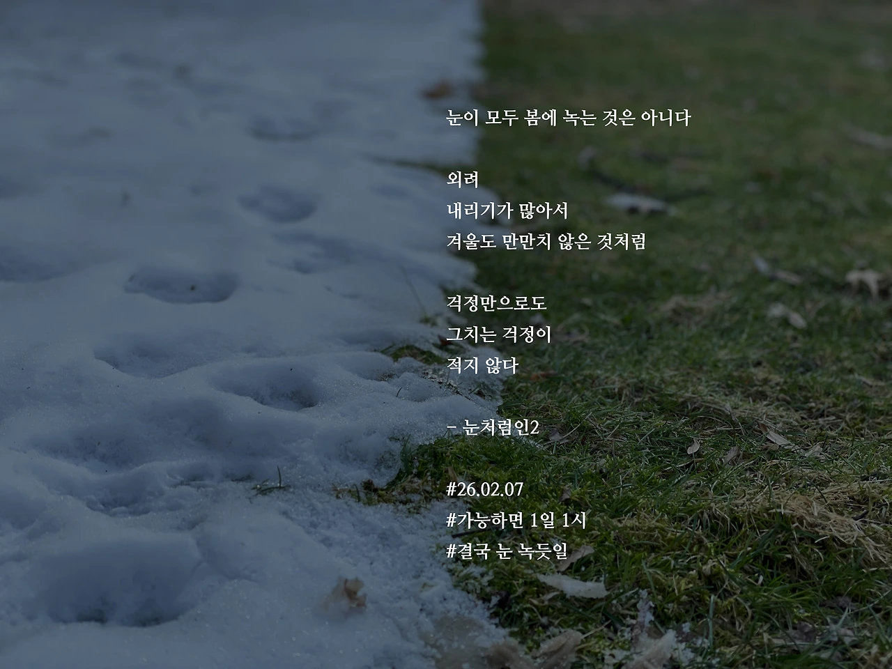 눈이 모두 봄에 녹는 것은 아니다외려내리기가 많아서겨울도 만만치 않은 것처럼걱정만으로도그치는 걱정이 적지 않다 - 눈처럼인2#26.02.07#가능하면 1일 1시#결국 눈 녹듯일 작가의 말: 걱정은 걱정일 뿐이라