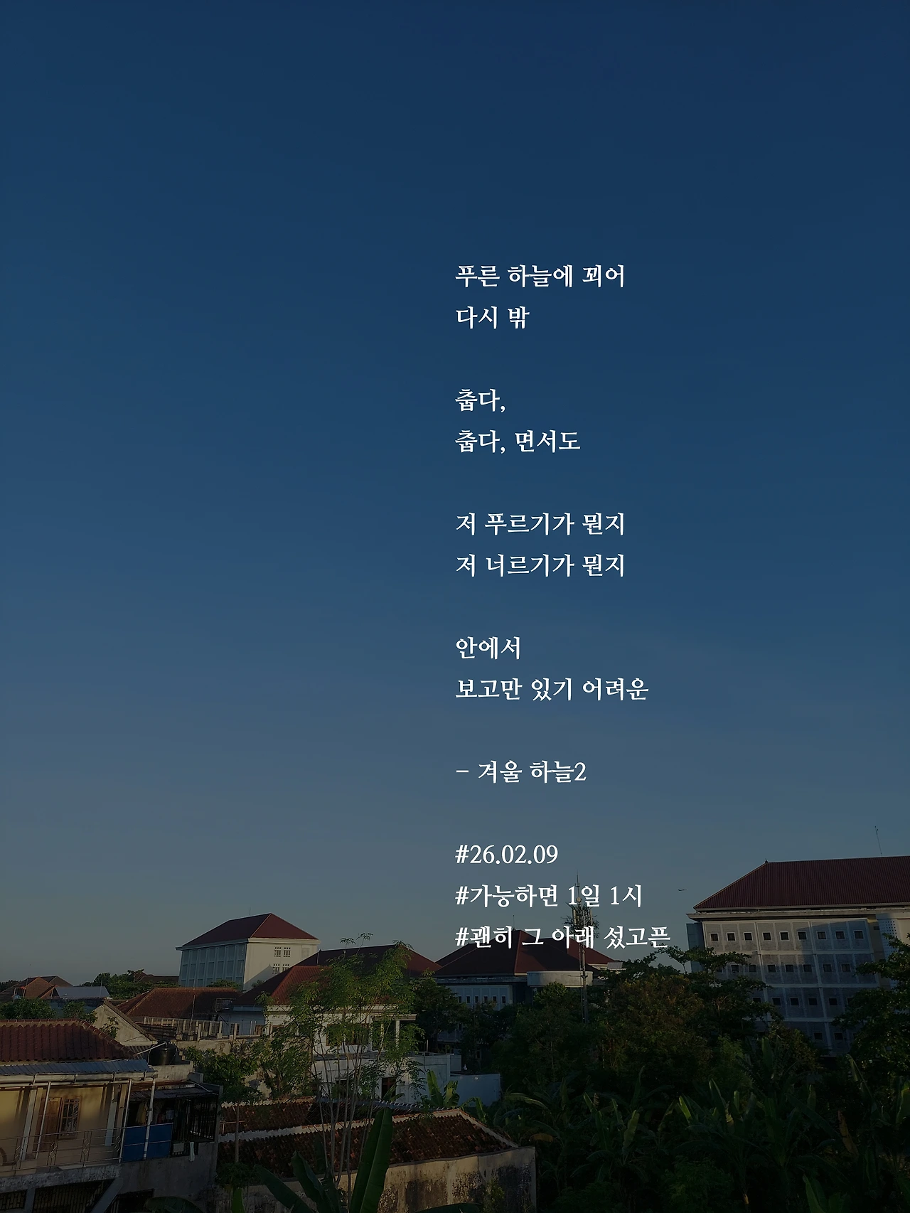 푸른 하늘에 꾀어다시 밖춥다,춥다, 면서도저 푸르기가 뭔지저 너르기가 뭔지안에서보고만 있기 어려운- 겨울 하늘2#26.02.09#가능하면 1일 1시#괜히 그 아래 섰고픈