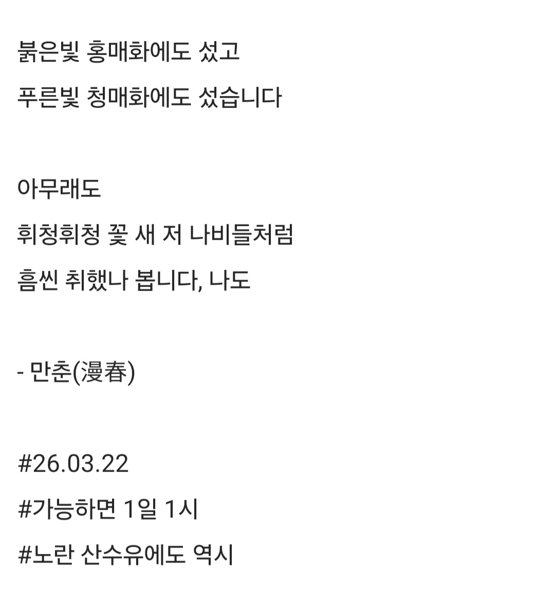 붉은빛 홍매화에도 섰고푸른빛 청매화에도 섰습니다아무래도휘청휘청 꽃 새 저 나비들처럼흠씬 취했나 봅니다, 나도- 만춘(漫春)#26.03.22#가능하면 1일 1시 #노란 산수유에도 역시