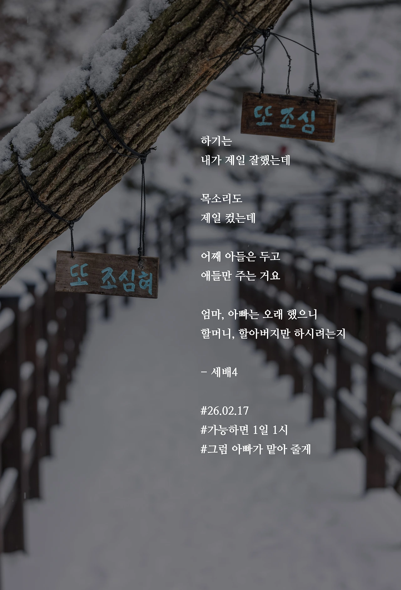 하기는내가 제일 잘했는데목소리도제일 컸는데어째 아들은 두고애들만 주는 거요엄마, 아빠는 오래 했으니할머니, 할아버지만 하시려는지- 세배4#26.02.17#가능하면 1일 1시#그럼 아빠가 맡아 줄게 작가의 말: 뭐든 오래하세요
