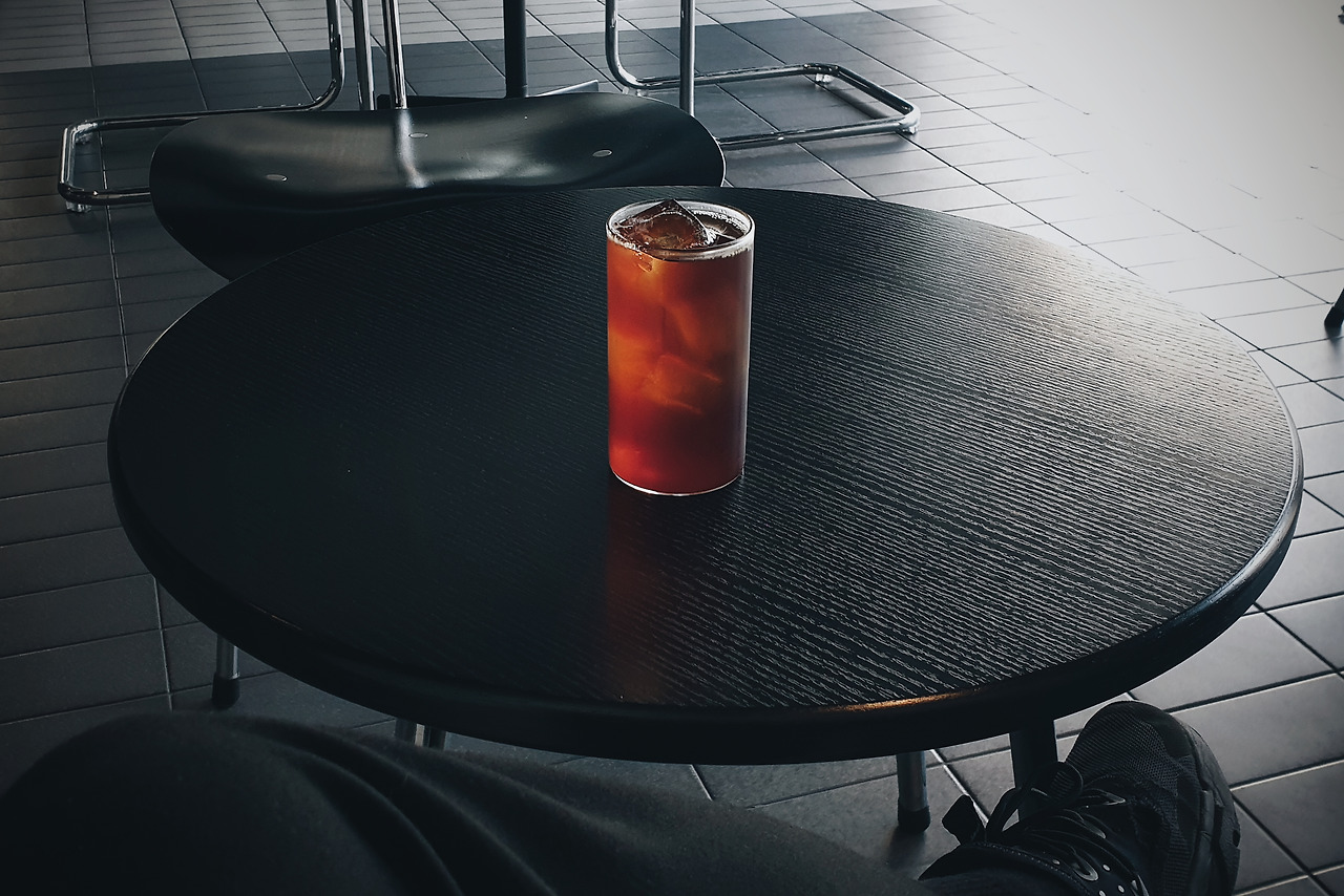시원한 게 필요해 브루잉으로 케냐 아이스를 주문한 뒤 찬찬히 주변을 둘러보며 검은색의 무거움을 만끽했다. 사방이 온통 까맣게 물들어있다. 평소에도 대부분 까만 옷만 입고 다니는 필자는 이날도 올블랙으로 입었다. 그래서인지 커피도 마시기 전에 내가 프로밧인지 프로밧이 나인지 모르게 새까만 대 환장 파티가 열렸다. 일종의 흑력 충전이랄까.