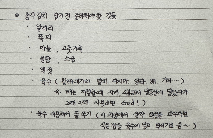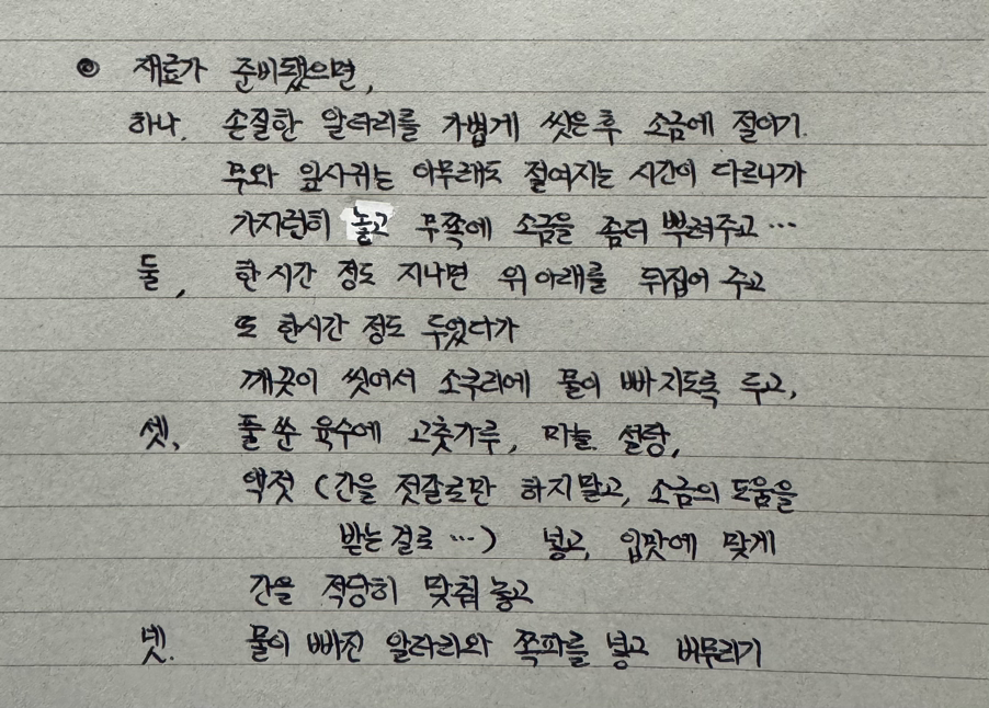 너에게 이 글을 쓰는 시간도 그래. 엄마에겐 지금 이 시간이 나중에 네게 먹일 음식들을 미리미리 채워 넣는 시간이야. 나는 이 시간이 좋아. 주말이 지나 내일이면 엄마, 아빠가 출근해야 한다는 걸 알기에 더 놀고 싶다며 유난히 길게 칭얼거리는 너를 겨우 달래 재우고선 그 옆에서 네게 남기는 할머니의 김치 레시피. 언젠가 배고픈 날에 이 김치가 너에게 시원하고 개운한 하루의 마무리가 되어주길.
