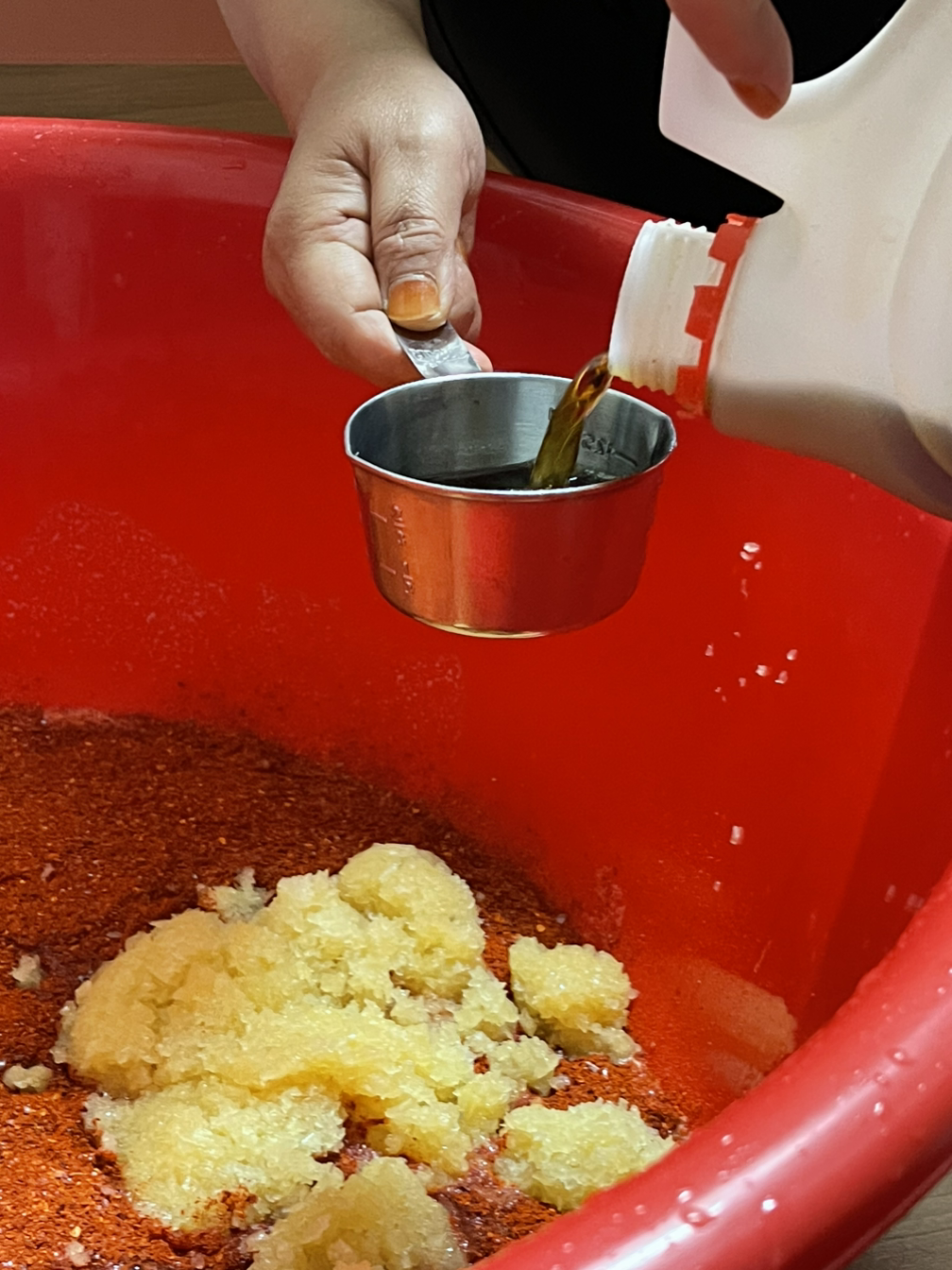 모든 음식의 간은 처음부터 세게 잡지 않는 게 좋아. 간이 약한 건 조금씩 추가하면 되지만 첫 간이 너무 세면 되돌리기 어렵거든. 총각김치는 이미 소금에 절여놓았기 때문에 더더욱 처음부터 많은 액젓을 넣지 않아. 중간중간 간을 보면서 반컵씩 추가하지. 할머니는 액젓은 멸치액젓이나 까나리액젓 아무거나 써도 상관없다 하셔. 다만 간이 맞을 때까지 액젓만 다 넣기보다는 액젓 냄새가 짙어졌다 싶을 때부터는 소금으로 간을 추가하지. 액젓이나 젓갈이 너무 많이 들어가면 나중에 김치에서 콤콤한 냄새가 나기도 하거든.