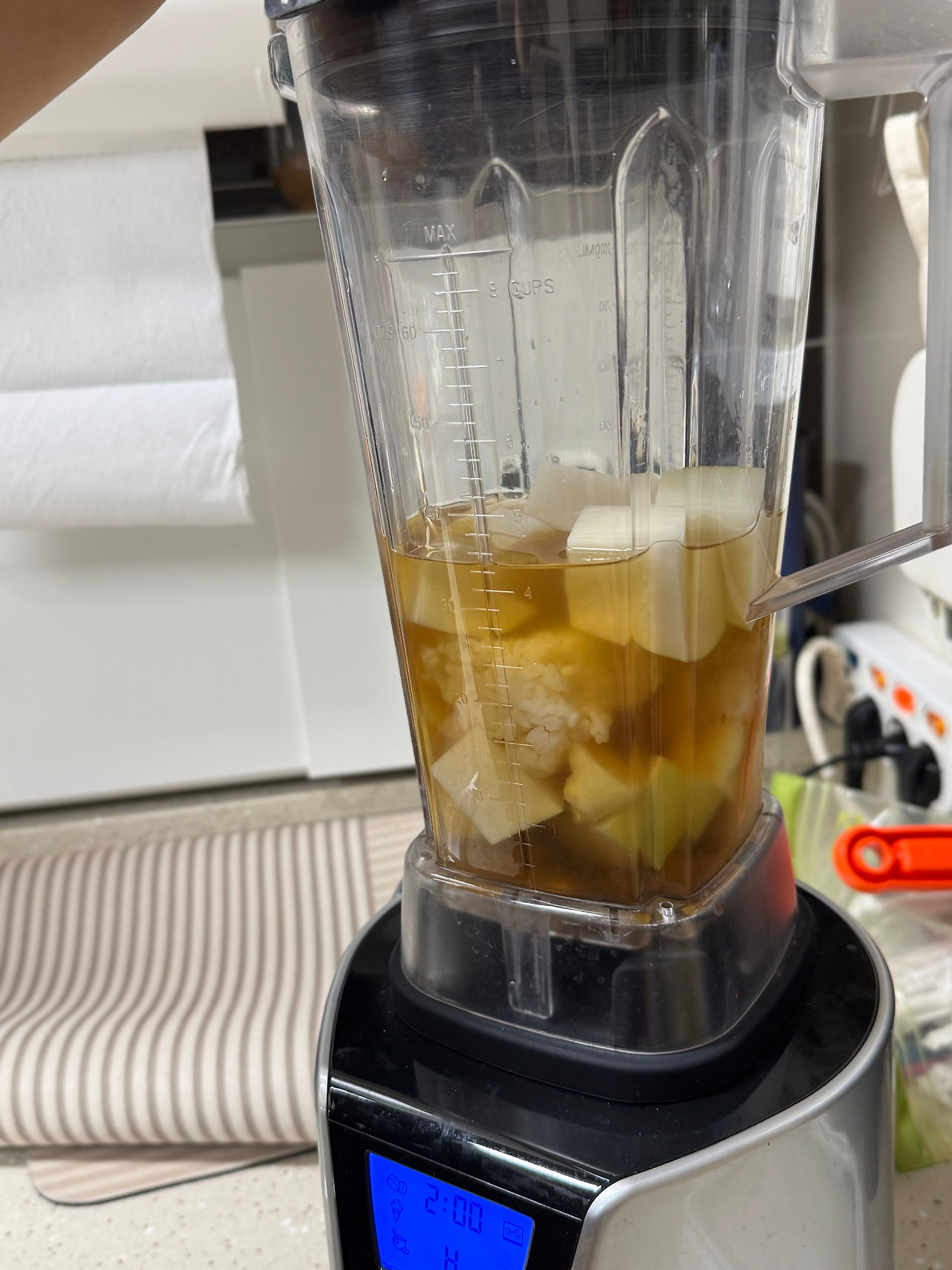 김장하는 날 우리 집의 아침은 항상 '왕-' 하는 믹서기 소리로 시작해. 할머니는 김장하기 전날 찰밥을 짓고, 육수를 우려내어 김장하는 당일 아침에 자투리 무를 넣고 한 번에 갈아주거든. 찹쌀풀을 쑤지 않는 할머니의 비법이지.
