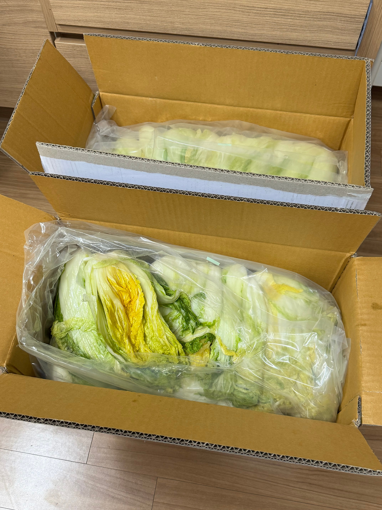 절임배추가 도착하면 박스의 위아래를 뒤집어줘. 아무리 잘 절여 오더라도 배송 오는 중에는 소금물이 아래로 몰려 있을 테니, 소금물이 전체적으로 고루 퍼질 수 있도록 해주는 거야. 한두 시간 정도 뒤집어 주었다면 넓은 채반에 올려 물기를 빼줘야 해.