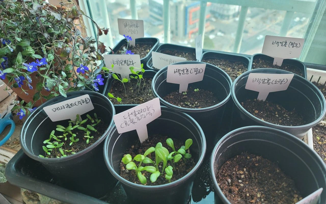 2월 중순쯤 화초 씨앗을 조그만 포트에 뿌린 다음 햇볕이 잘 드는 베란다에 두었다. 백일홍, 네모 필라, 다알리아, 메리골드 등. 여러 색깔의 백일홍 씨앗 중 핑크 백일홍만 발아에 성공했다. 조만간 포트에 나누어 비닐하우스에서 모종으로 키워도 될 것 같다.