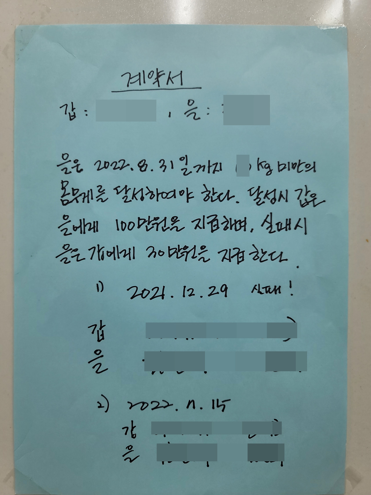 체중을 줄이면 모두 해결될 것 같은데, 노력은 하지만 몇 년째 비슷한 몸무게를 유지하고 있다. 특단의 조치가 필요했다. 사실은 올해 3.31일까지 달성하도록 계약서를 썼었다. 하지만 3.31일에 쑤니씨는 체중계에 올라가지 않았다. 실패하고도 30만 원을 내놓지 않았다.