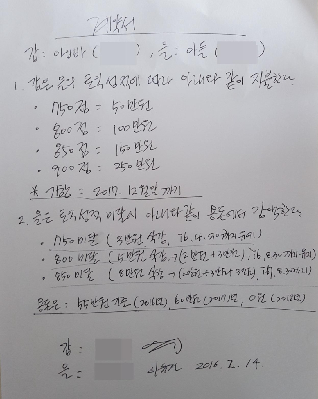 아들이 대학생 때 토익 성적을 두고 맺은 계약서
