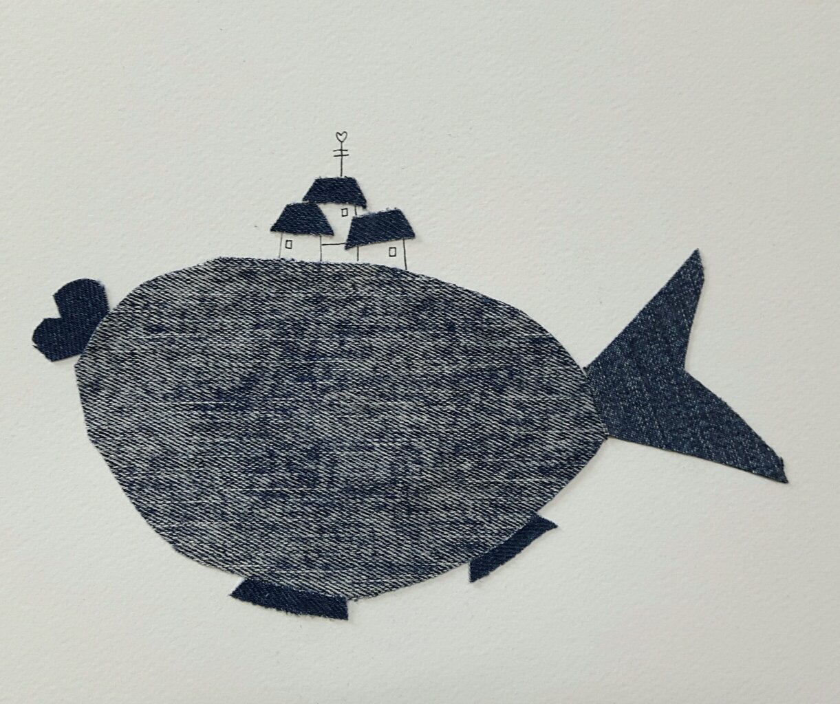 집을 그리고 지붕은 청바지 조각을 잘라붙였어요