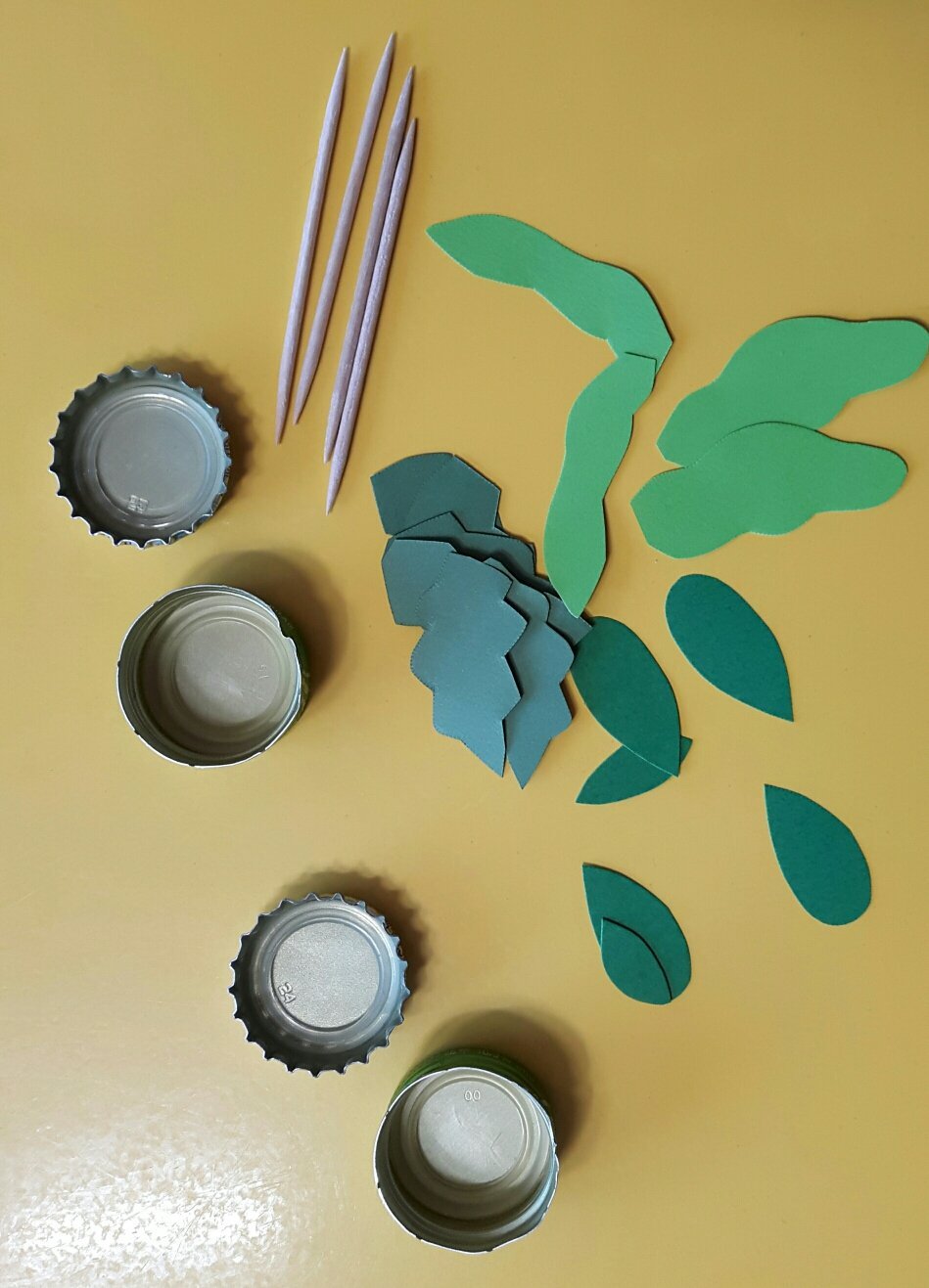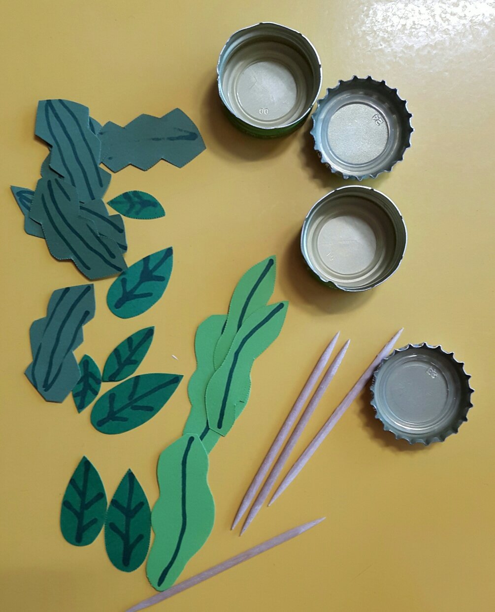 병뚜껑.그린계열 색상지.이쑤시개,네임펜,클레이