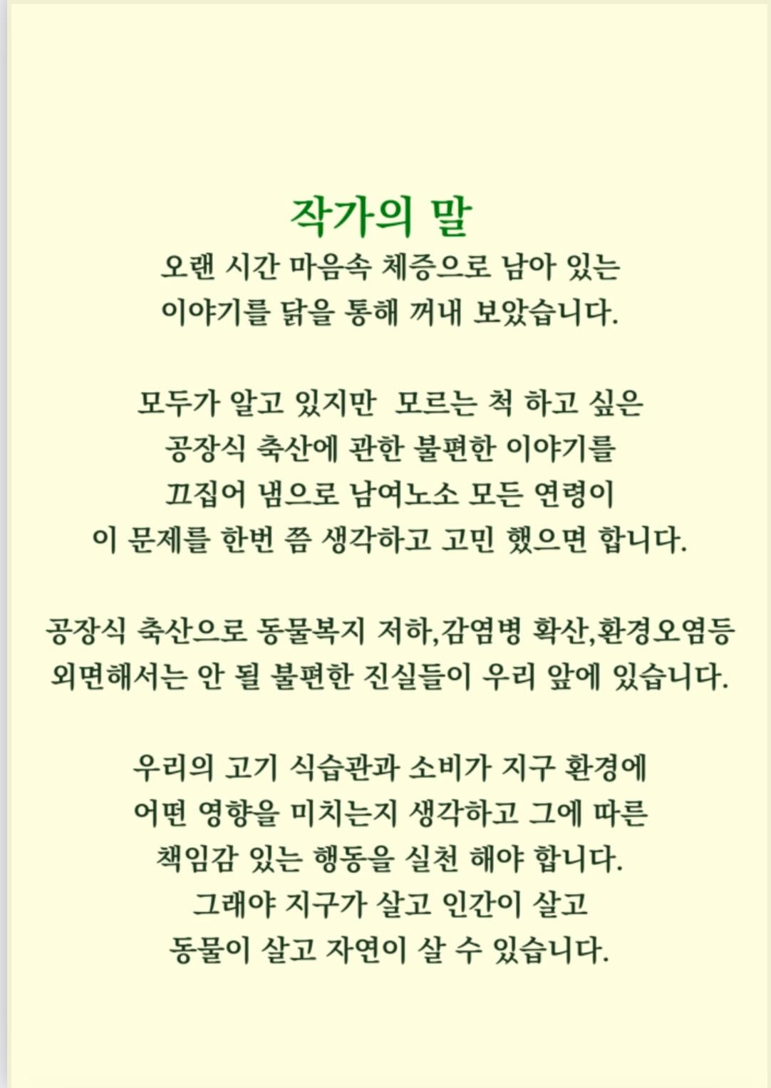 이래서는 안 되겠다 마음을 먹었고 강좌는 끝났지만 선생님께서 보내 주신 참고 링크와 배운 기법등을 떠뜸떠뜸 느리지만 천천히 활용하며 평소 생각하고 있던 환경에 관한 이야기 중 동물복지 그림책을 완성해 보았다