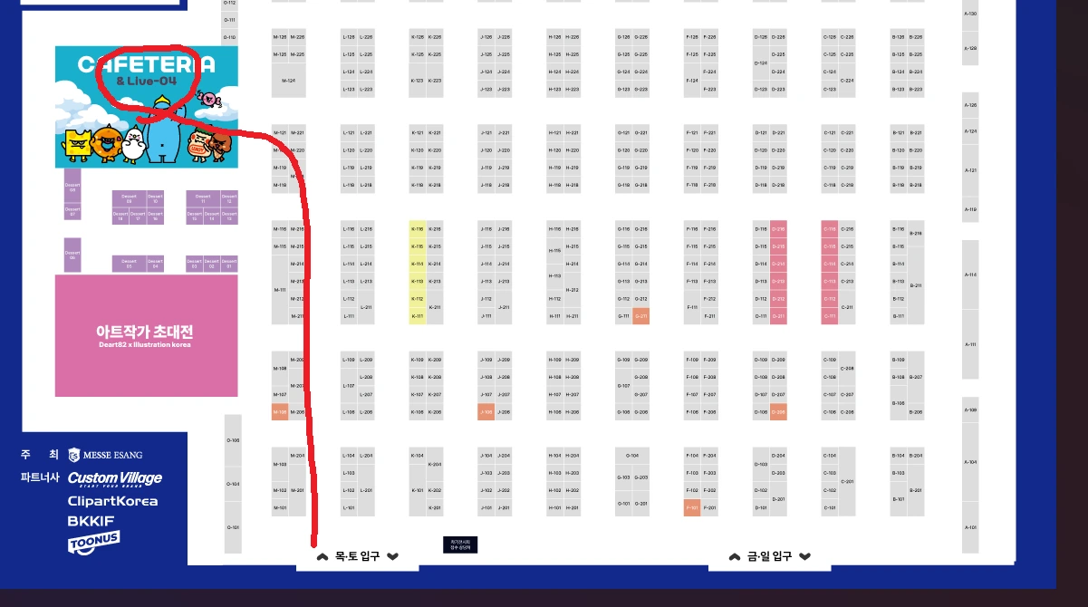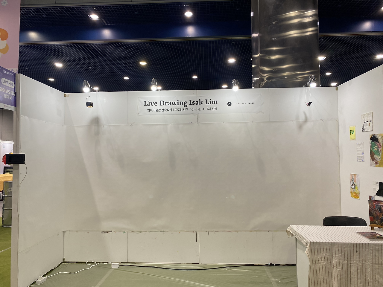 옆에 다른 부스가 연결되어 있지 않아서 몰리는 관람객으로 인한 옆 부스에 방해를 안 드릴듯해 다행이고 카페테리아 음악으로 하루 종일 시끄러울듯해 이삭작가가 어떨지 걱정이었다