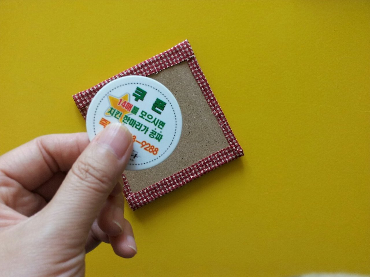 박스지 뒷면에 치킨집 냉장고 자석 쿠폰을 화이트본드로 살짝 붙여보세요