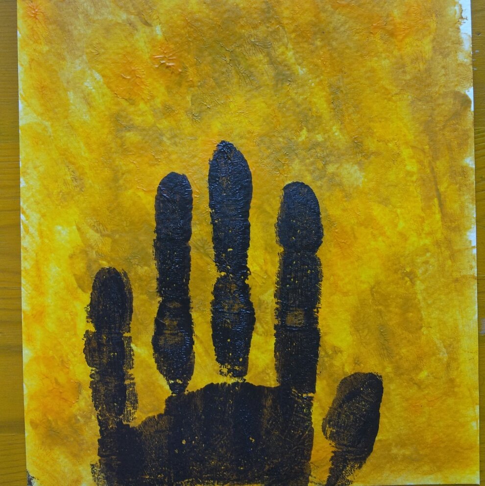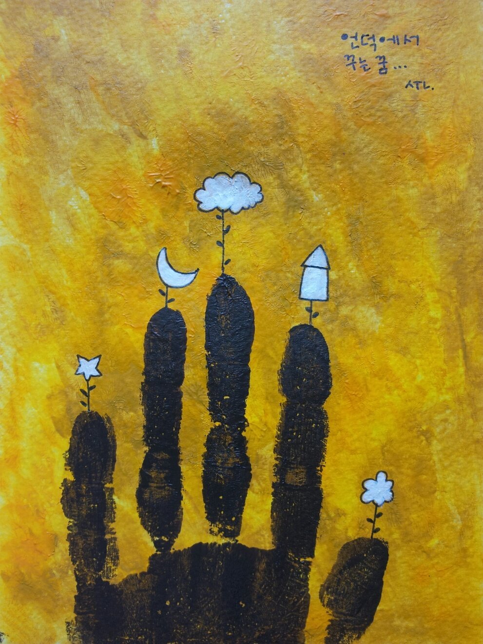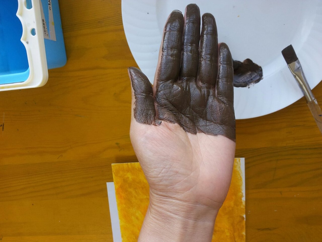 손바닥반쪽에 밤색 아크릴을 칠해주세요