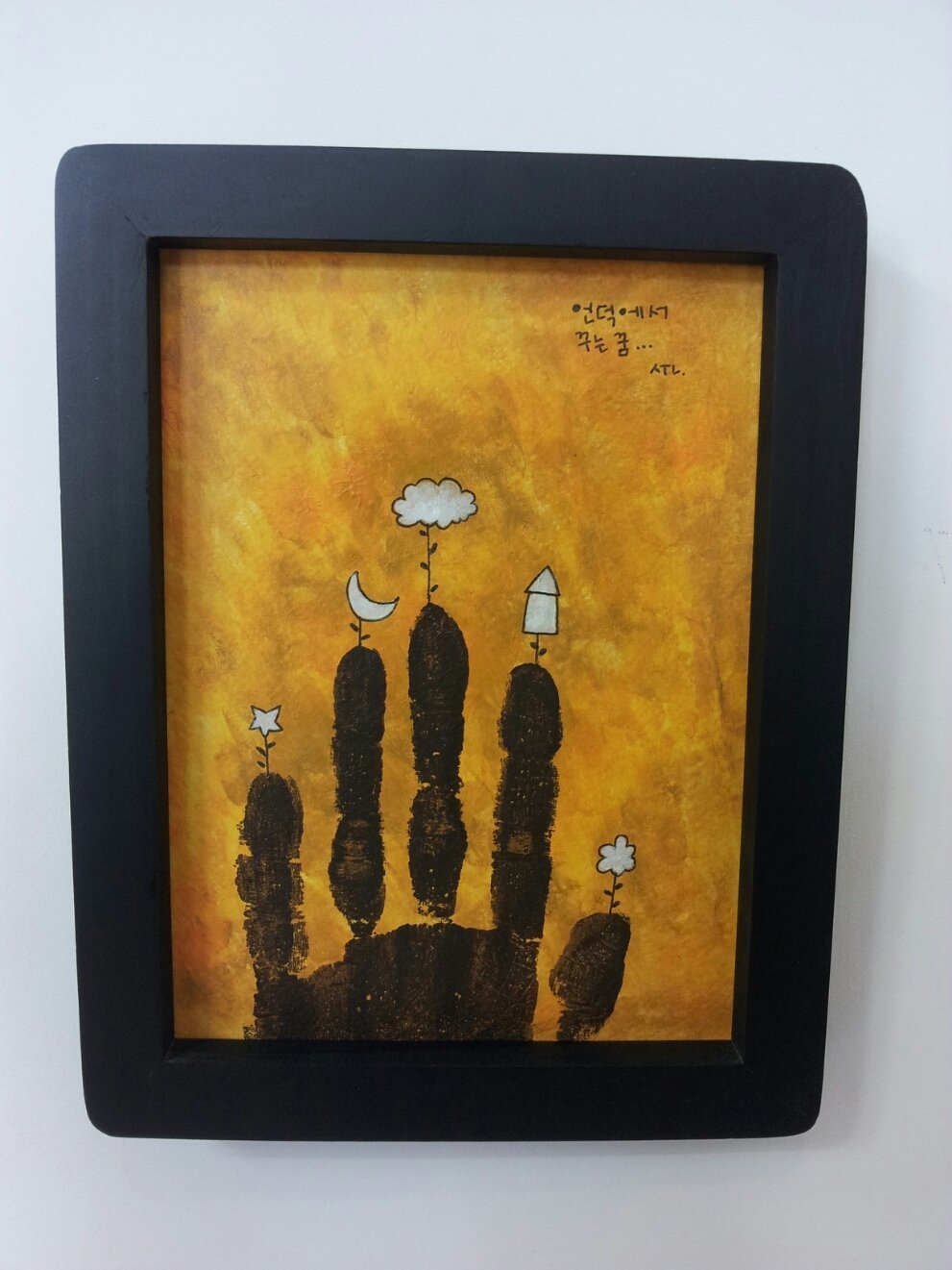 비슷한계열색 아크릴물감3가지(노랑,레몬,황토),흰색.밤색아크릴물감,작은붓.네임펜,