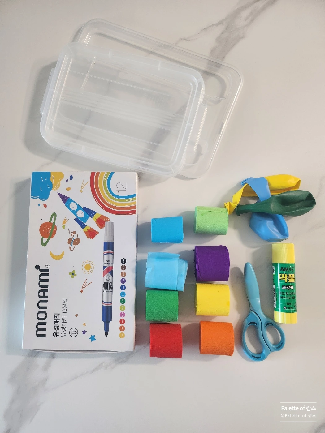 ▶준비물: 풍선, 매직, 스트리머 종이 (다이소 판매함), 풀, 테이프, 가위, 플라스틱 박스 뚜껑 등