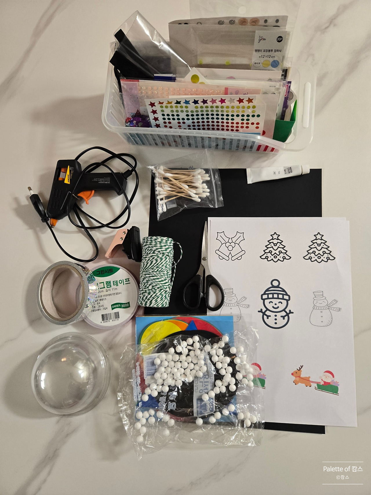목공용 풀, 스티커, 가위, 면봉, 흰색 물감, 펀치, 실 등