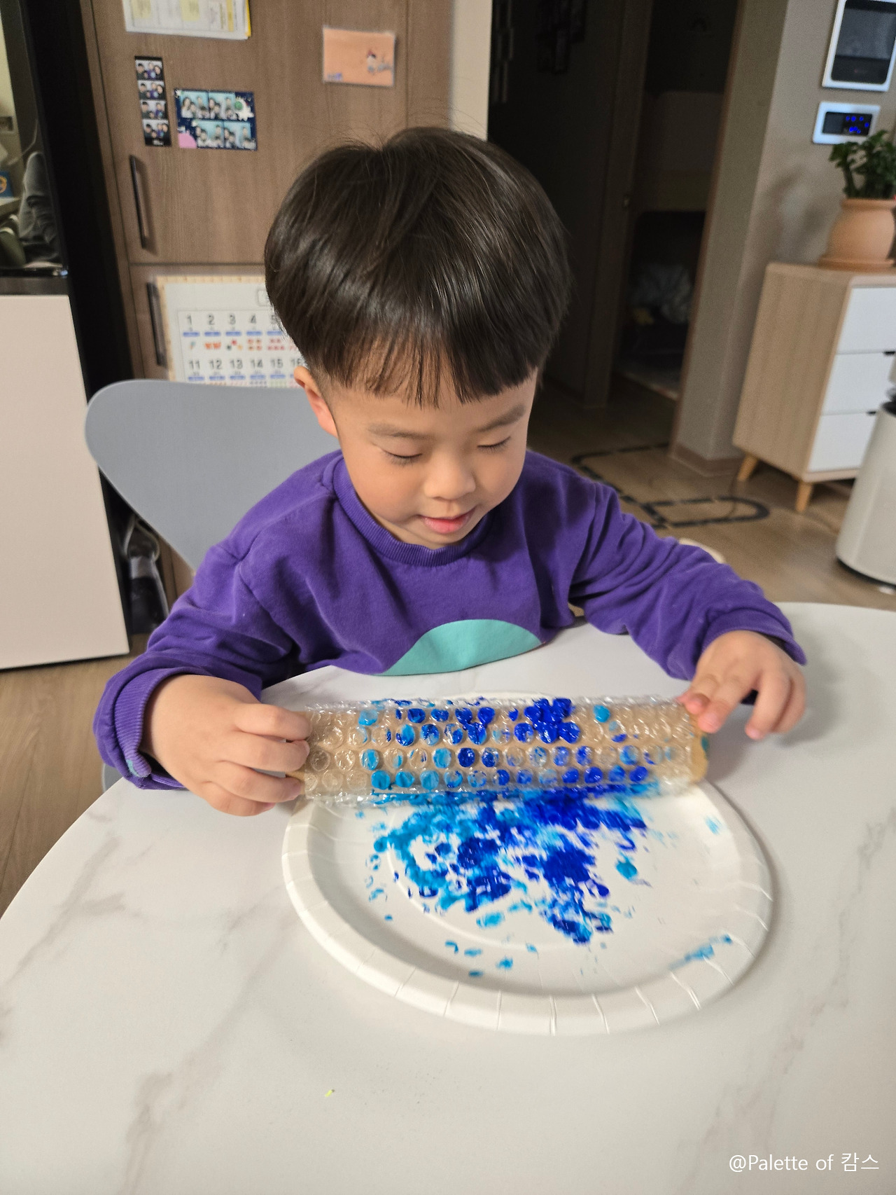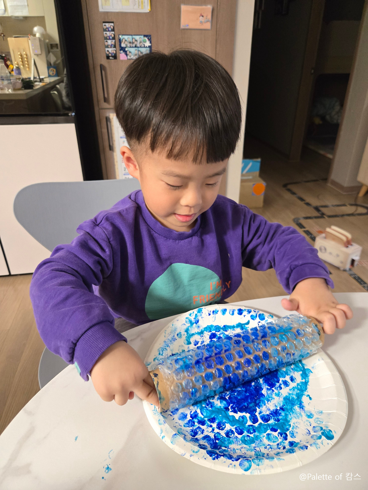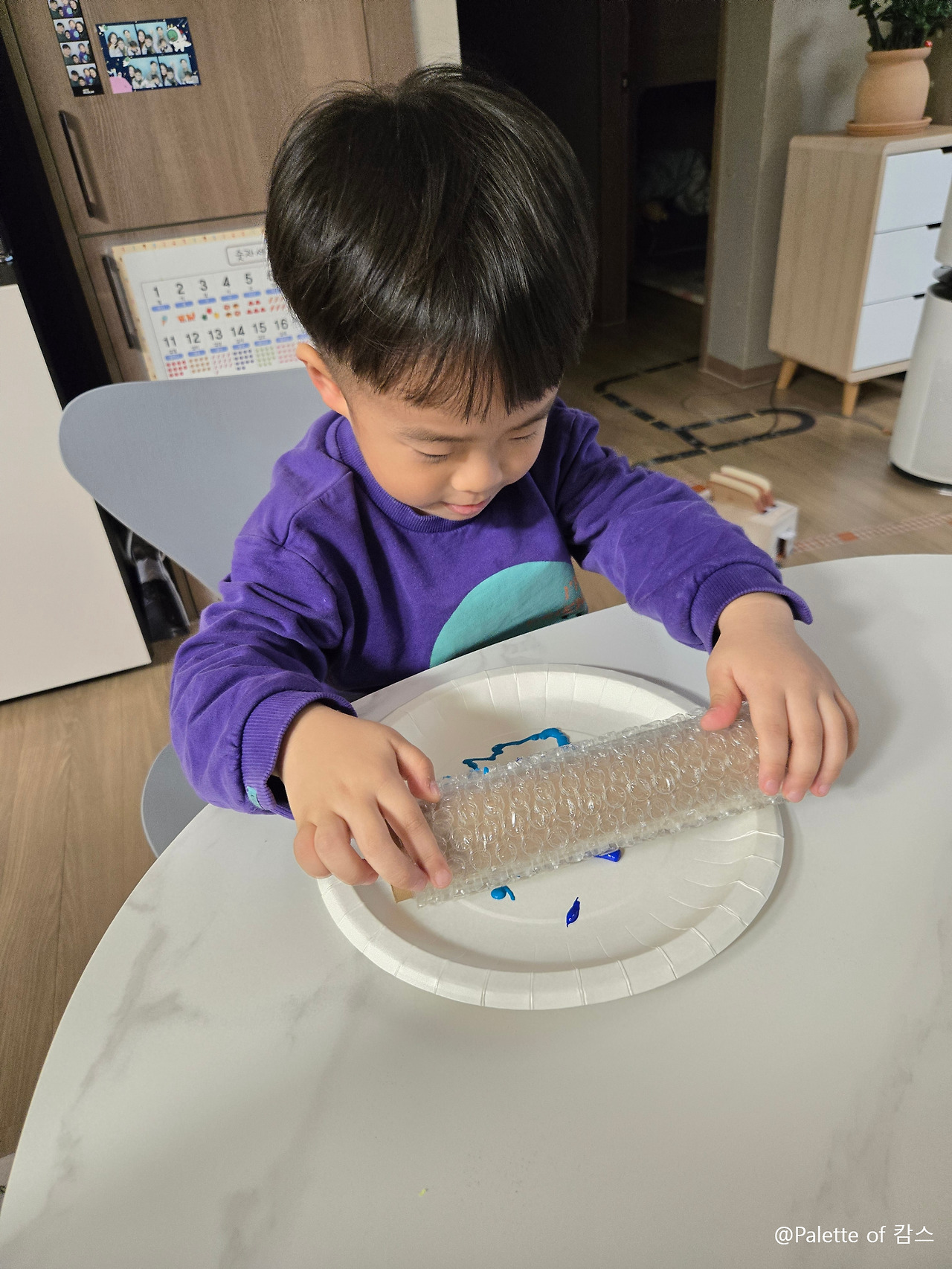 뽁뽁이를 감싼 휴지심으로 종이 접시 위를 전체적으로 굴립니다.