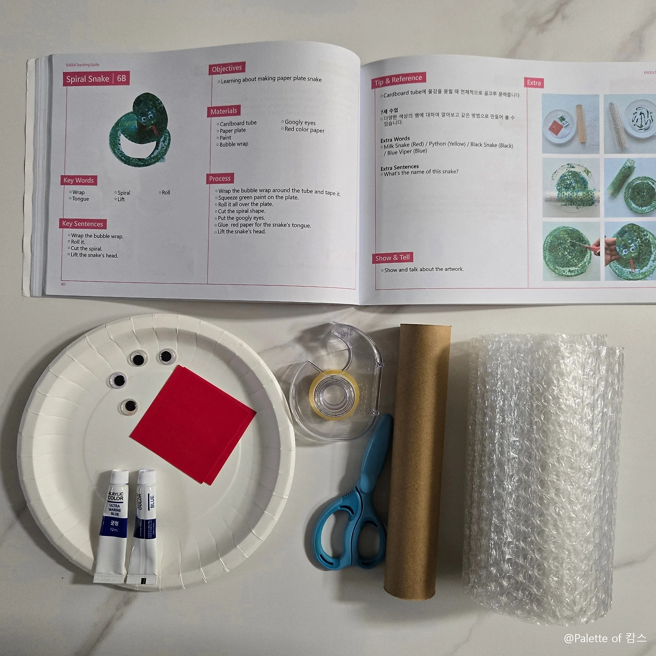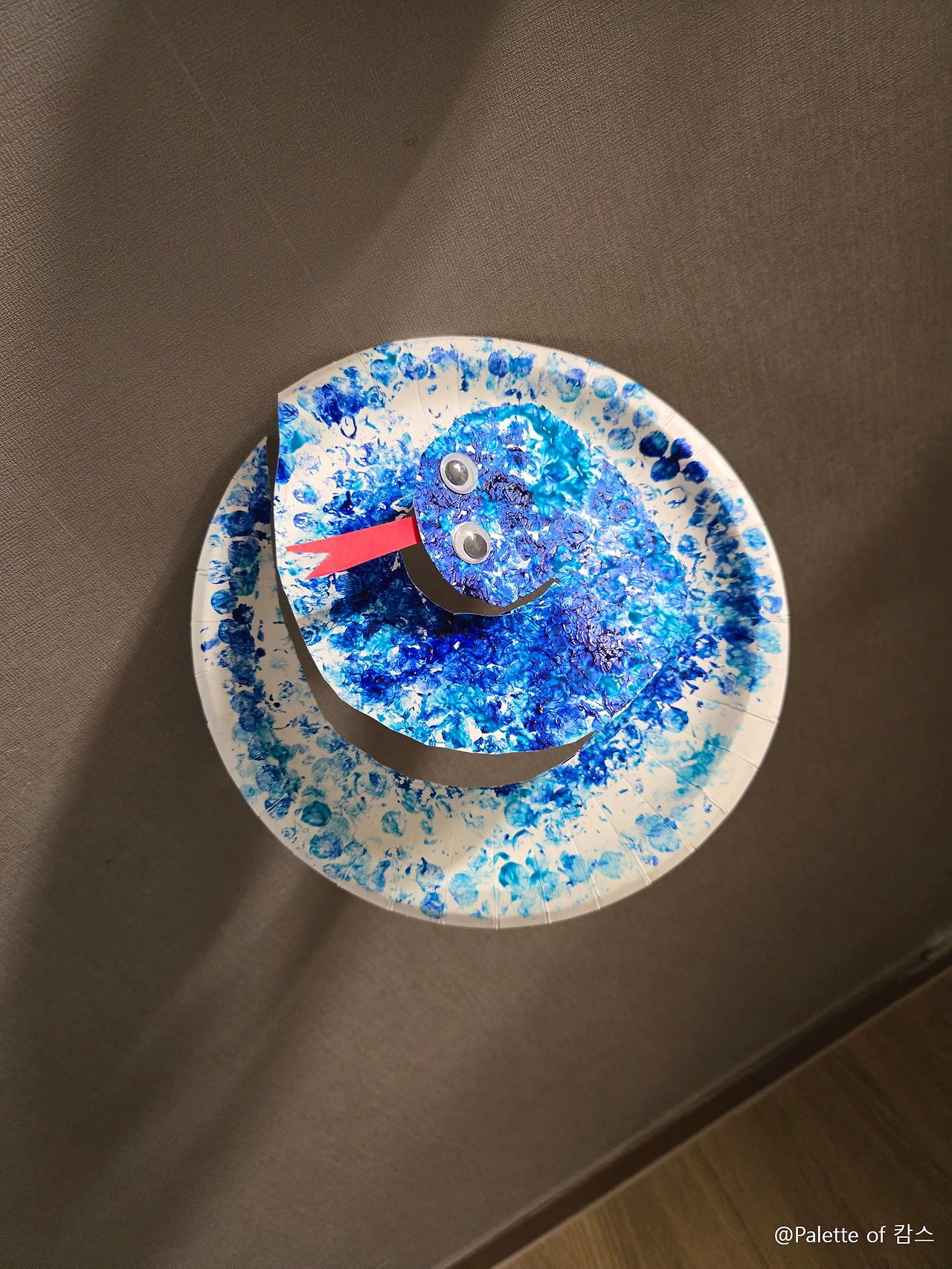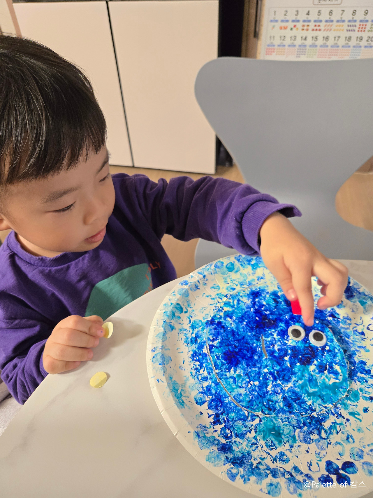 ◆ 준비물: 포장 뽁뽁이, Googly eyes, 일회용 종이 접시, 빨간색 색종이, 블루계열 물감,