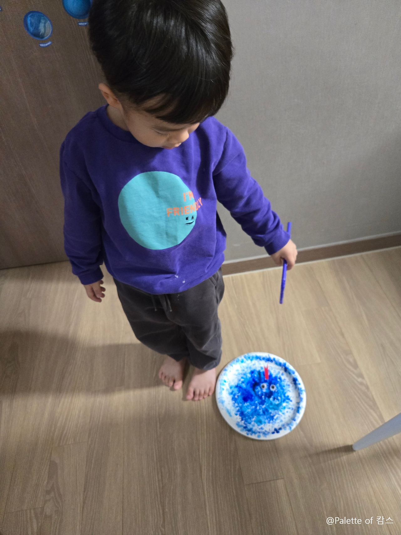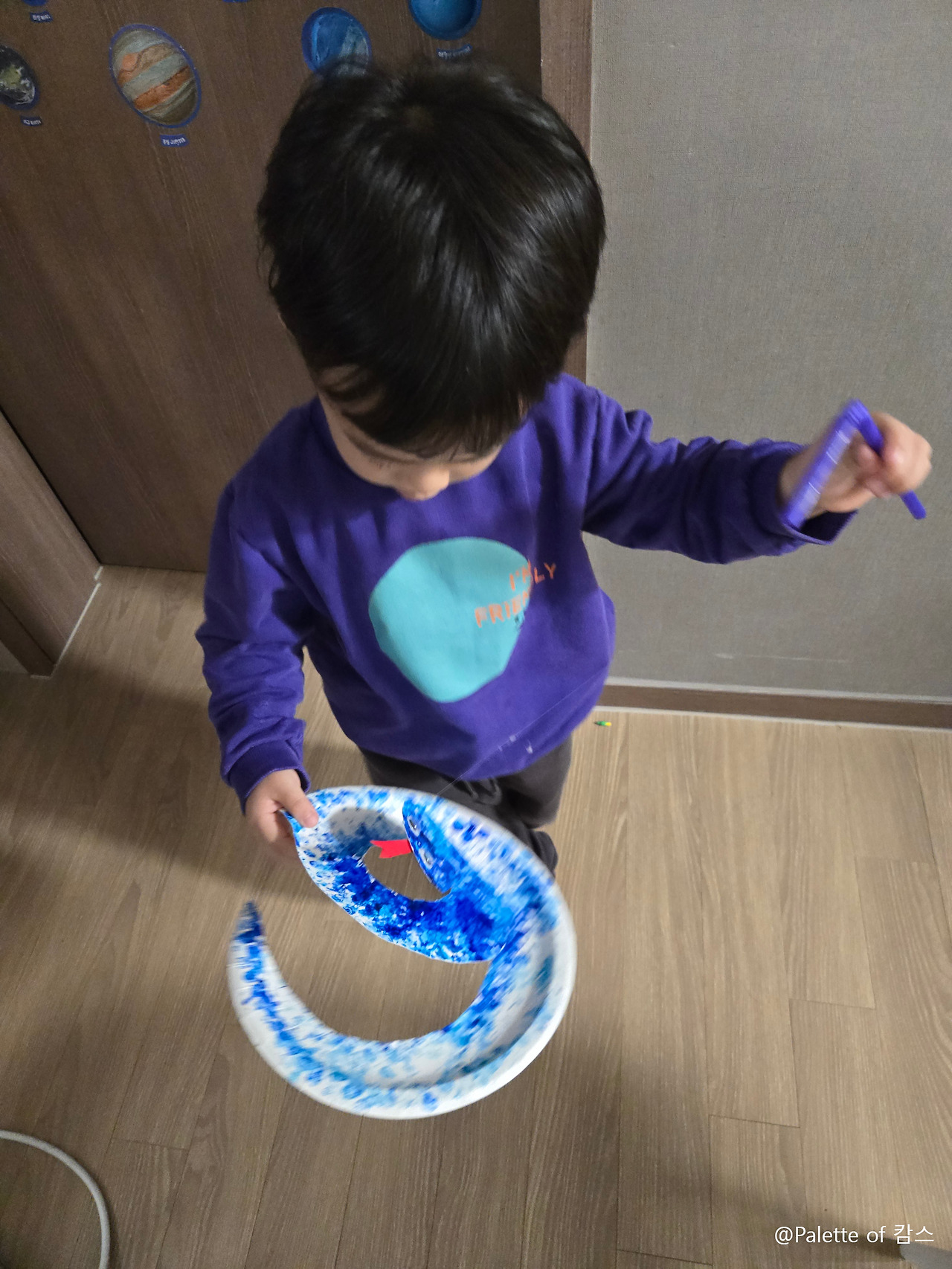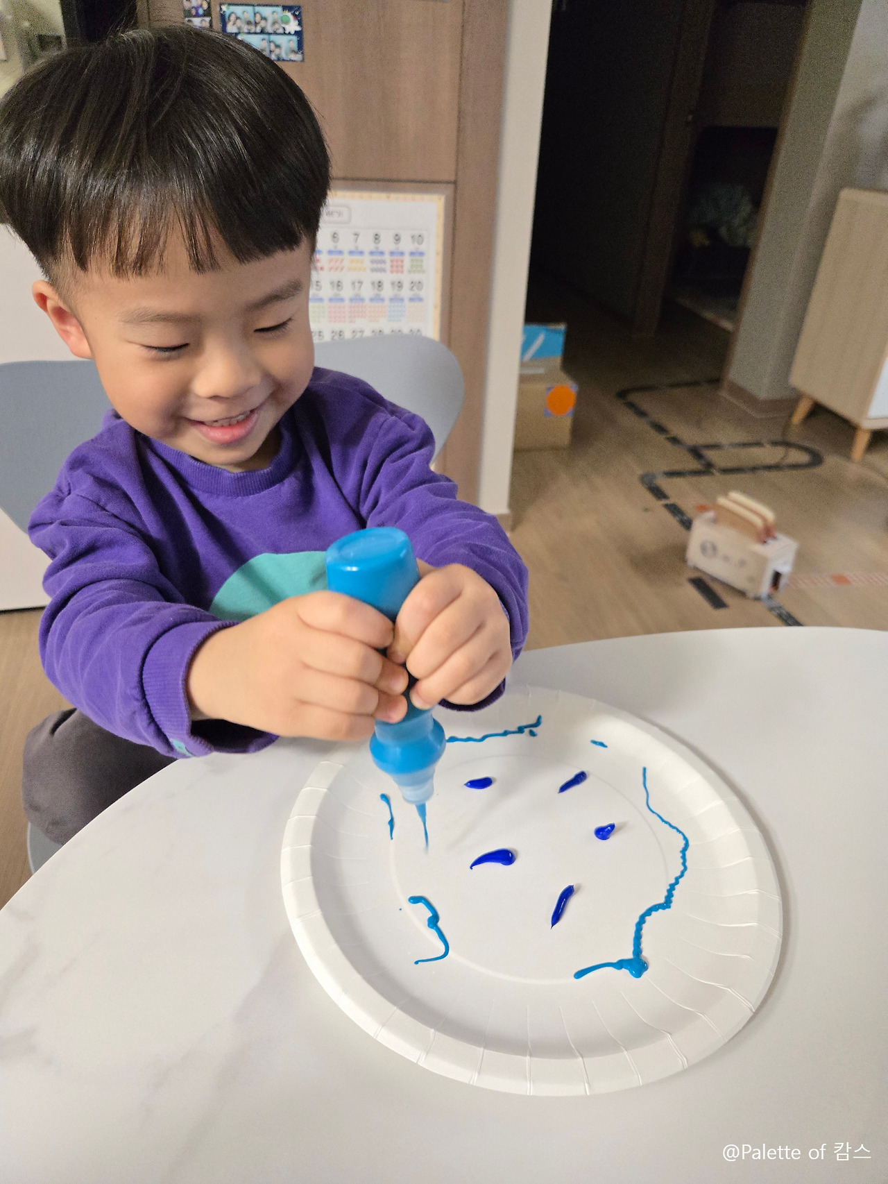 블루 계열의 물감을 종이 접시에 짜줍니다.