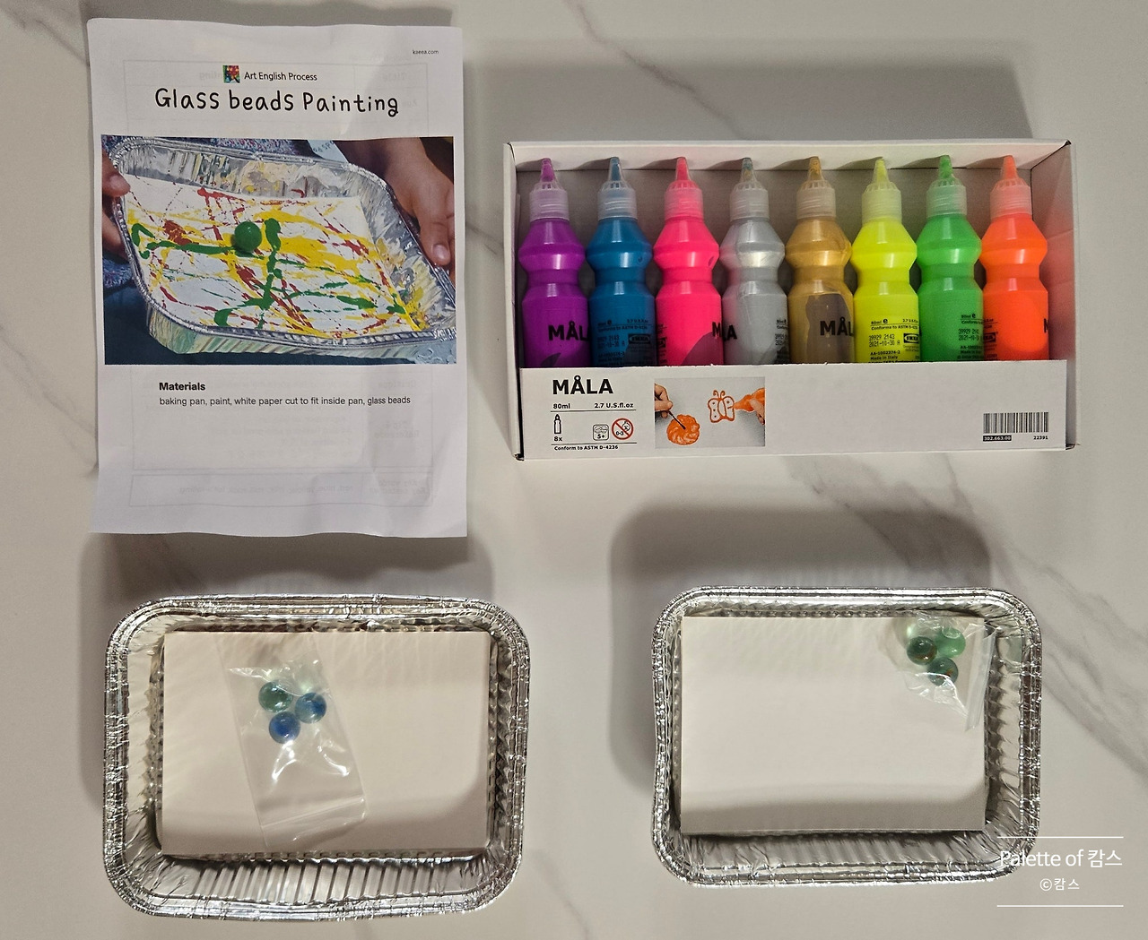 ◆ 준비물: 구슬, 호일 트레이(일회용 베이킹 팬), 도화지, 물감, 칼 등