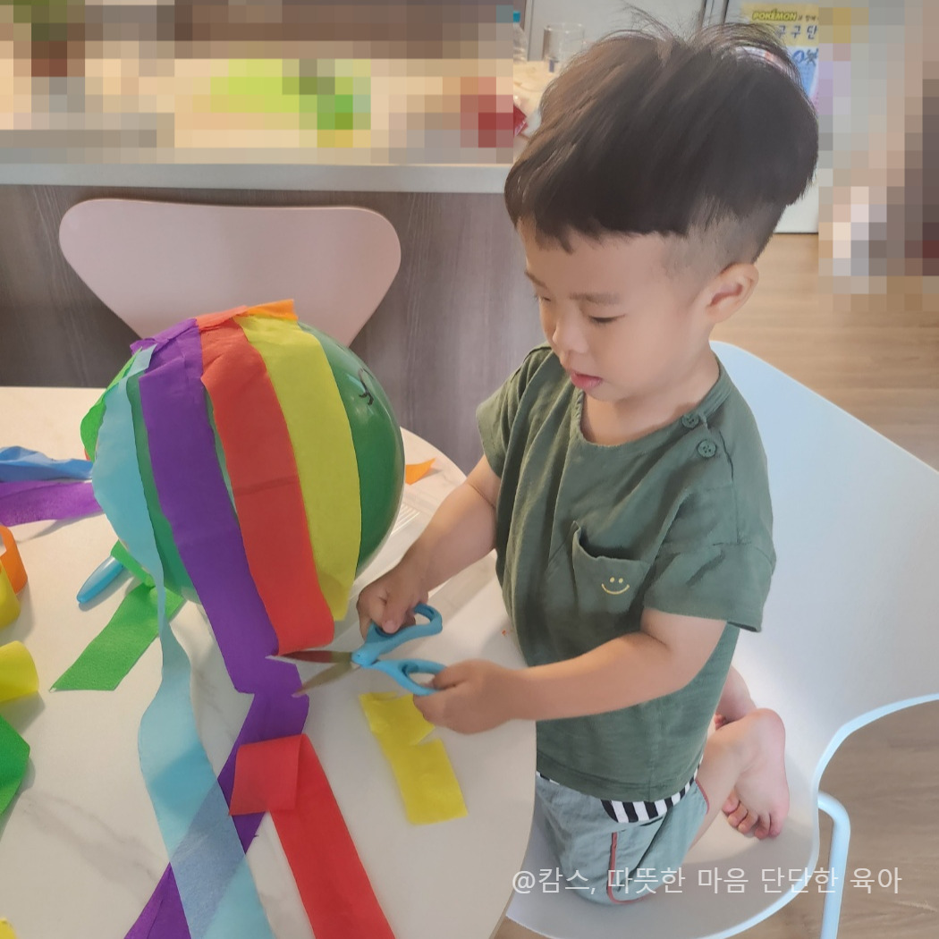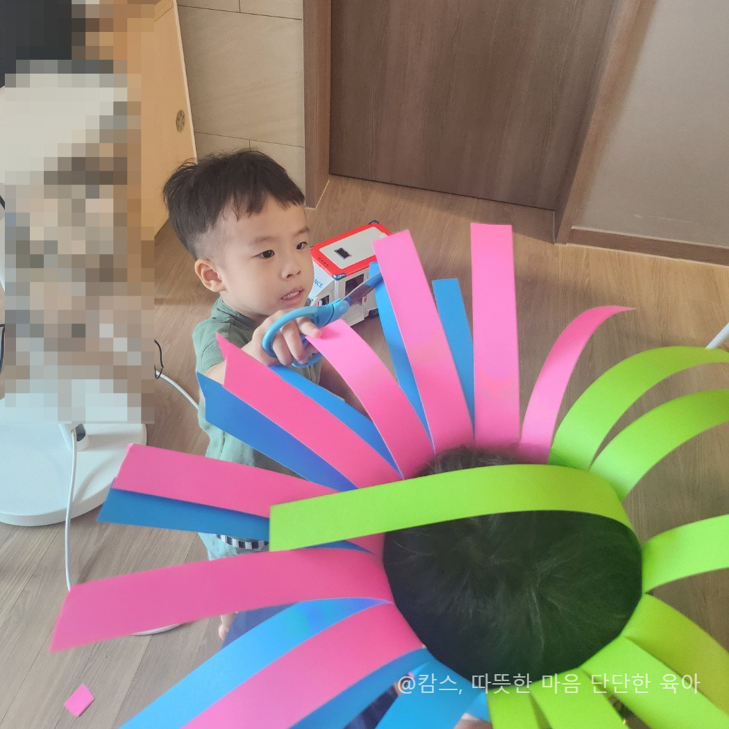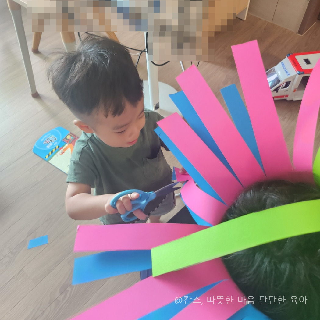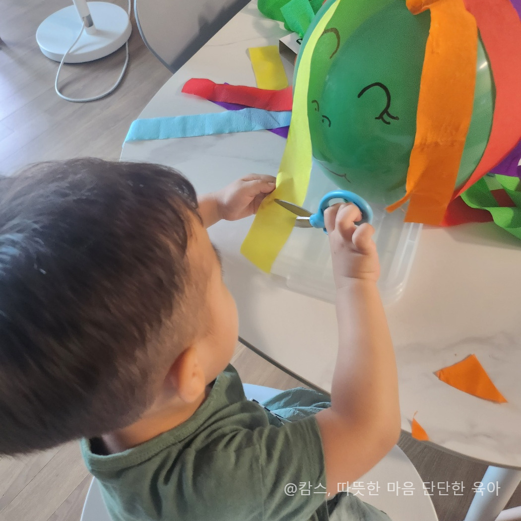 첫 가위질 연습으로 추천하는 놀이입니다.