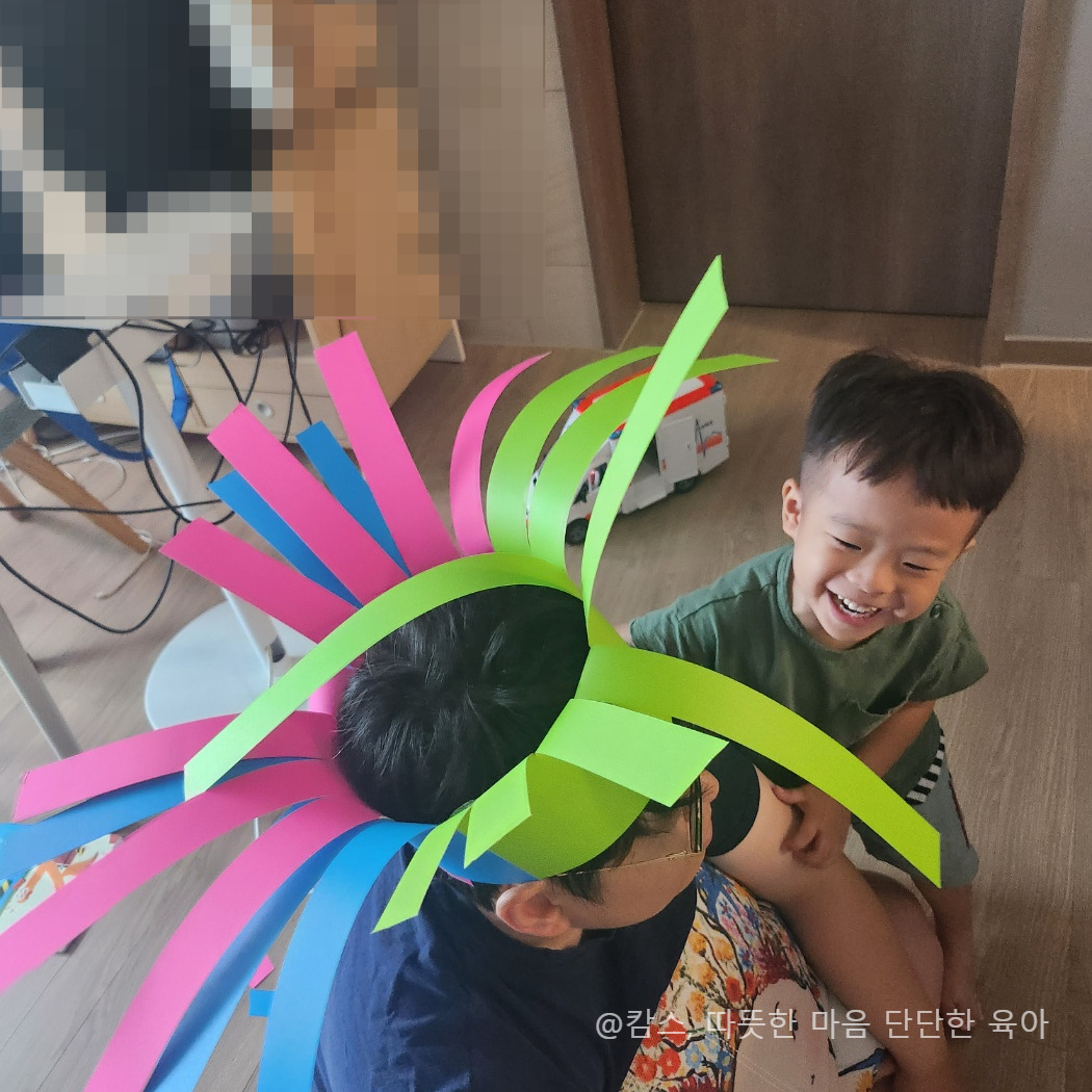 아빠 머리에 얹으니… 아이들이 빵! 터졌죠.