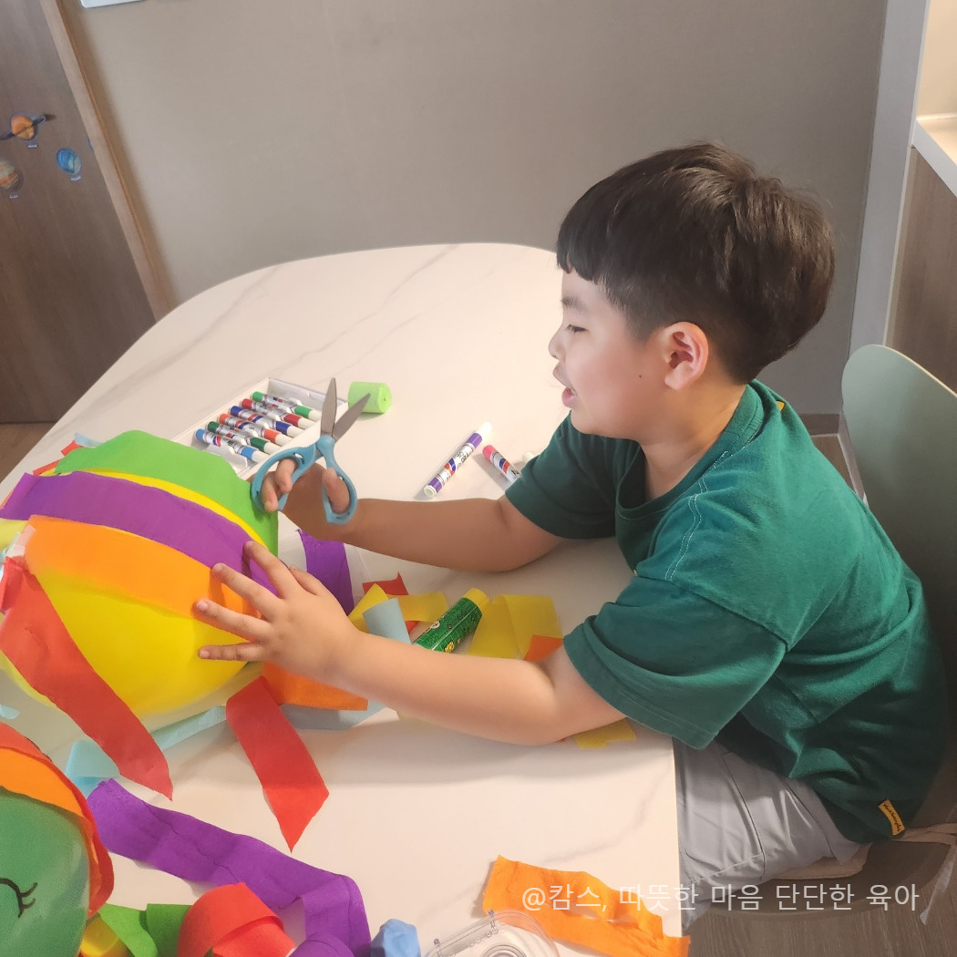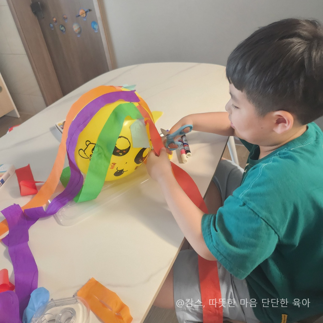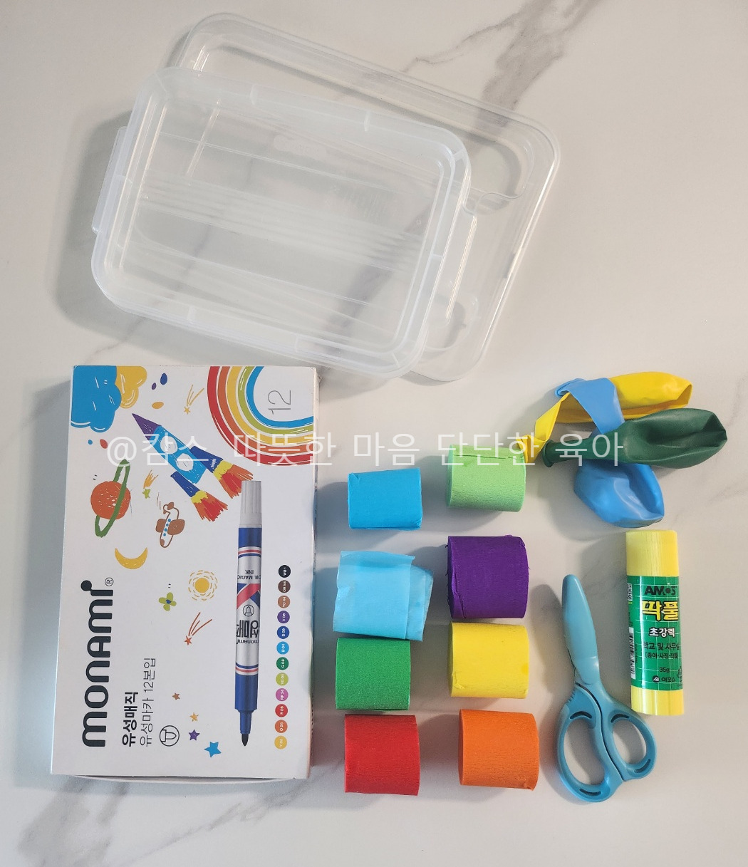 ▶준비물: 풍선, 매직, 스트리머 종이(다이소에서 구매 가능), 풀, 테이프, 가위,