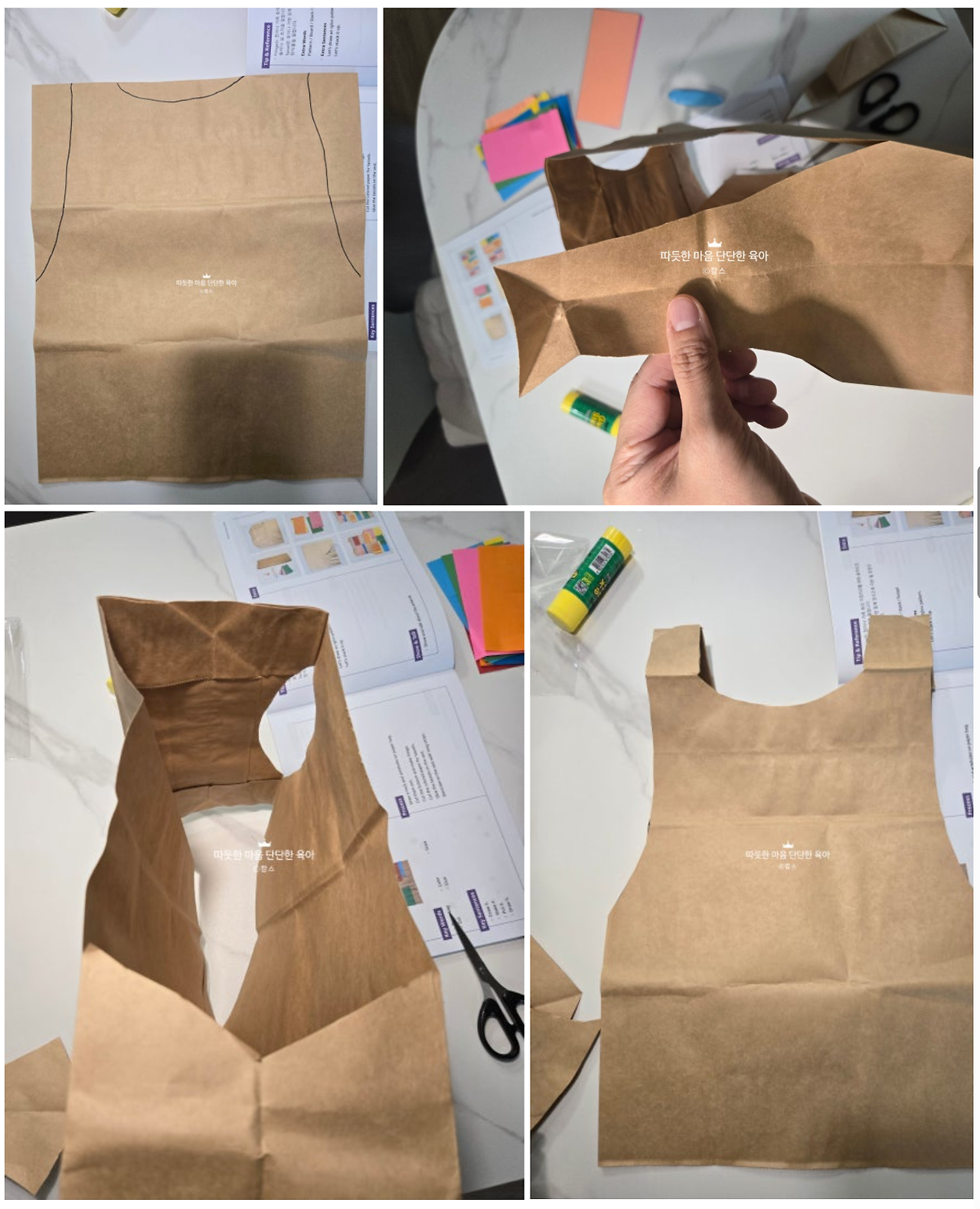 1. 종이가방에 목부분과 팔 부분 그려서 가위로 잘라 줍니다.