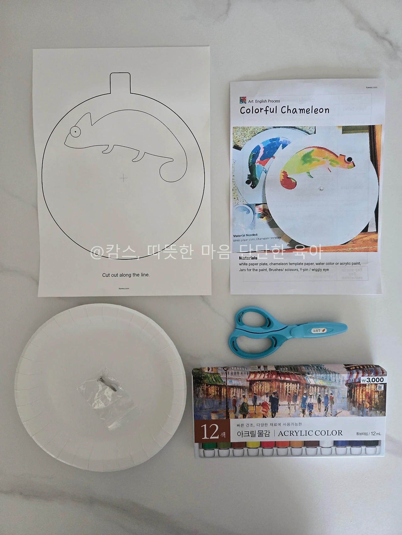 물감, 붓, 가위, 할핀 1개(Y-pin), 눈알 스티커 1개.
