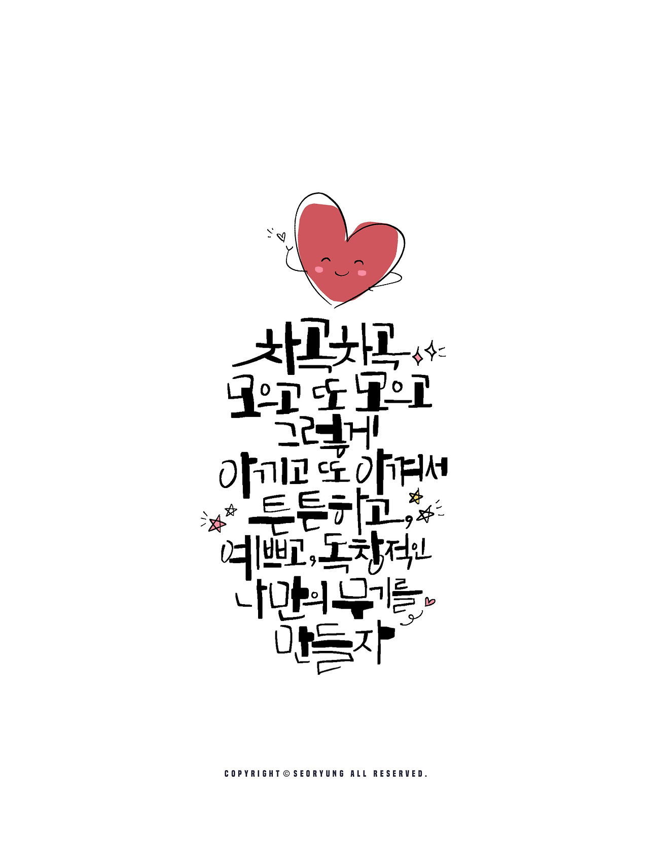 서울문학에서 시인으로 등단하였으며, 매일 글을 쓰고 있습니다. 현재 캘리그라피 프리랜서 작가로 활동중이며, 글이 차곡차곡 쌓이면 예쁜 책 한 권 내는 것이 삶의 큰 목표입니다.